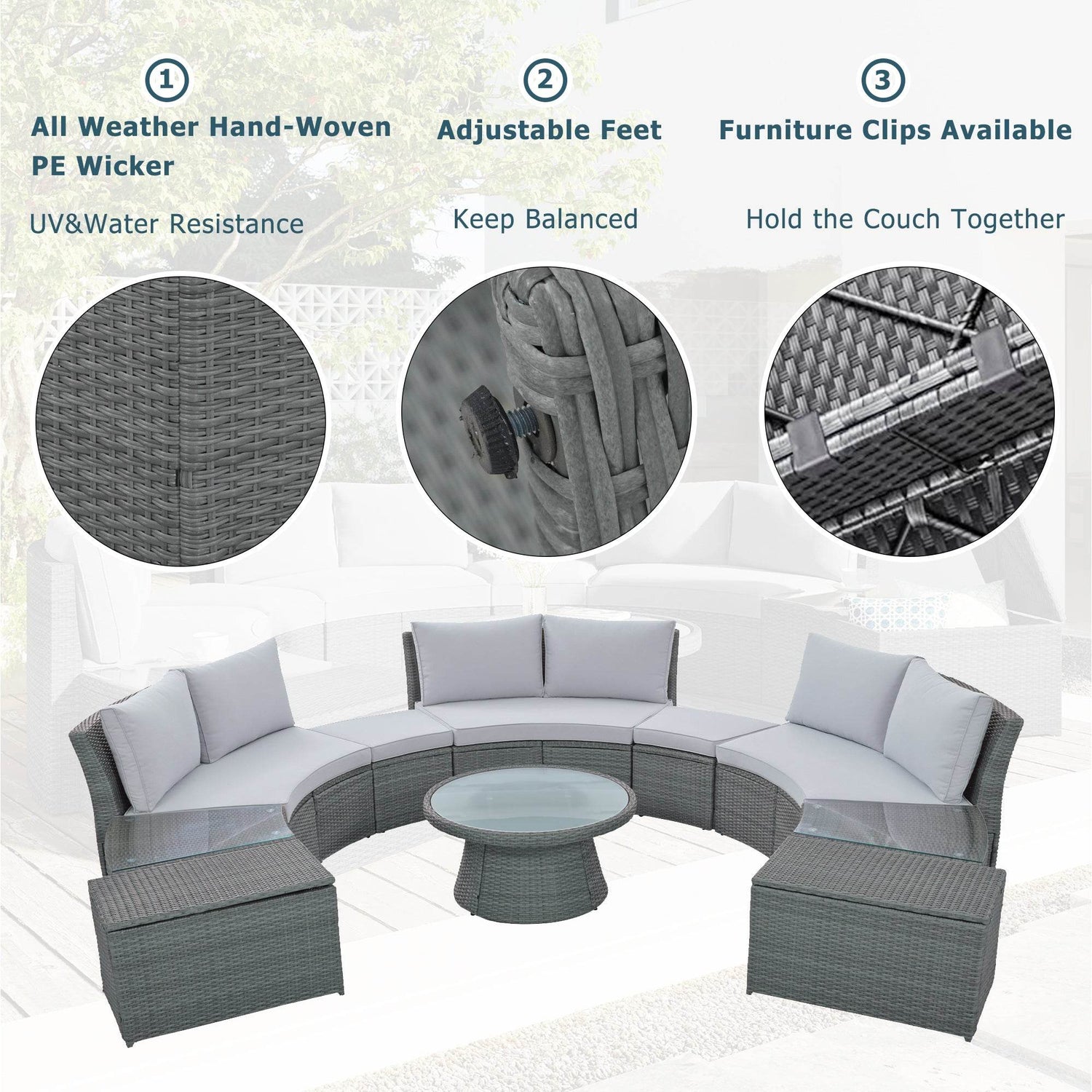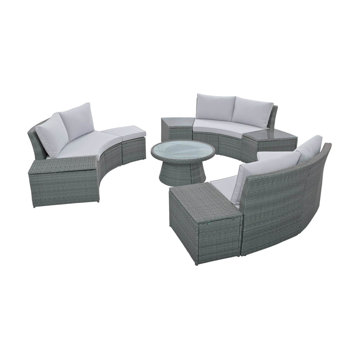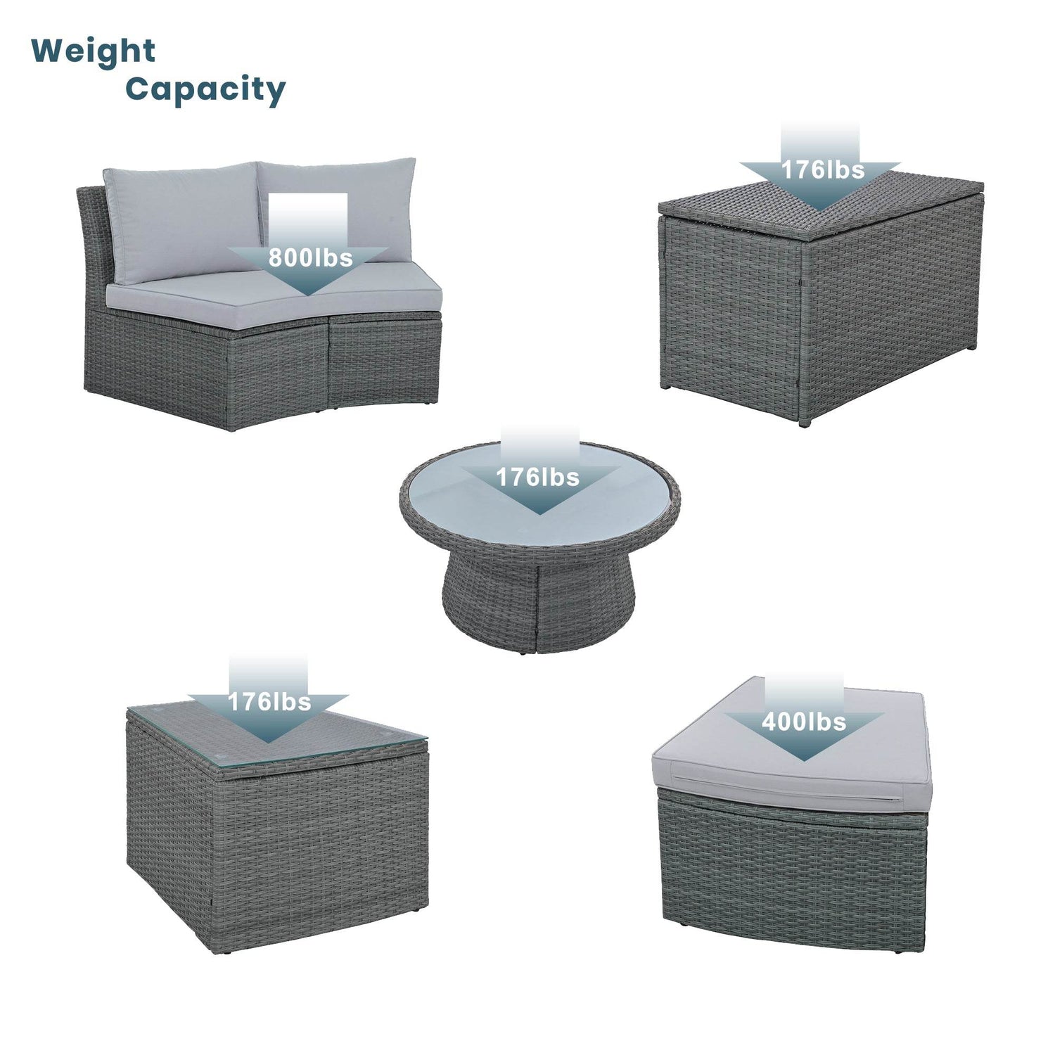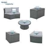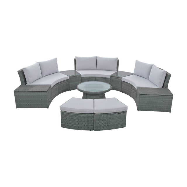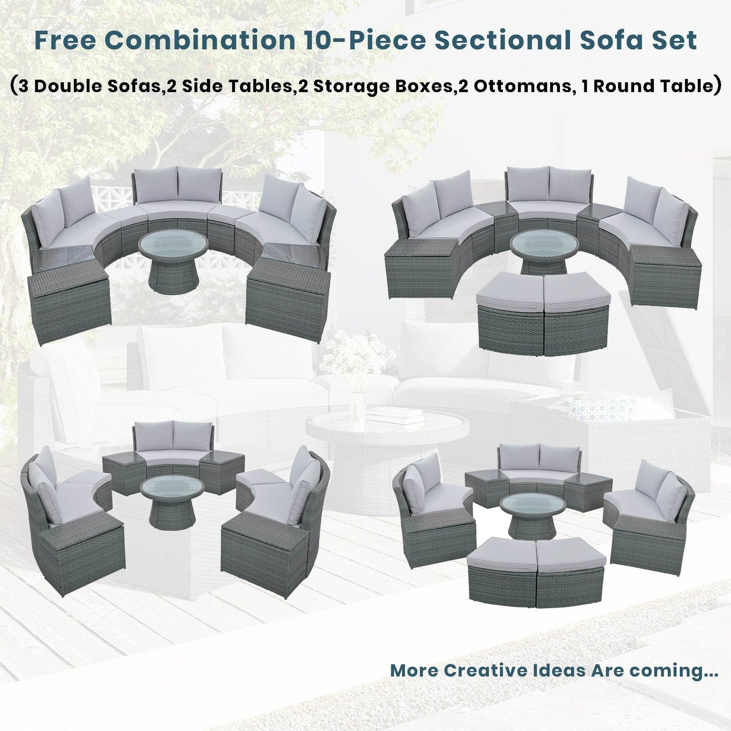 Create a welcoming outdoor living space with this versatile 10-piece patio sofa set. Crafted from durable PE wicker and solid steel frames, it delivers lasting strength and weather resistance for garden, porch, or poolside use. The light gray finish complements any outdoor decor with a modern yet casual aesthetic. Thick 3.15-inch (8 cm) foam cushions provide plush seating comfort, while the removable covers make upkeep simple. Multiple tables and storage stools add convenience for drinks, meals, and accessories, with tempered glass surfaces that wipe clean easily. Designed for free combination, each piece can be rearranged to suit your space and style, providing flexible seating for family and guests. Elevate your outdoor relaxation and social gatherings today.