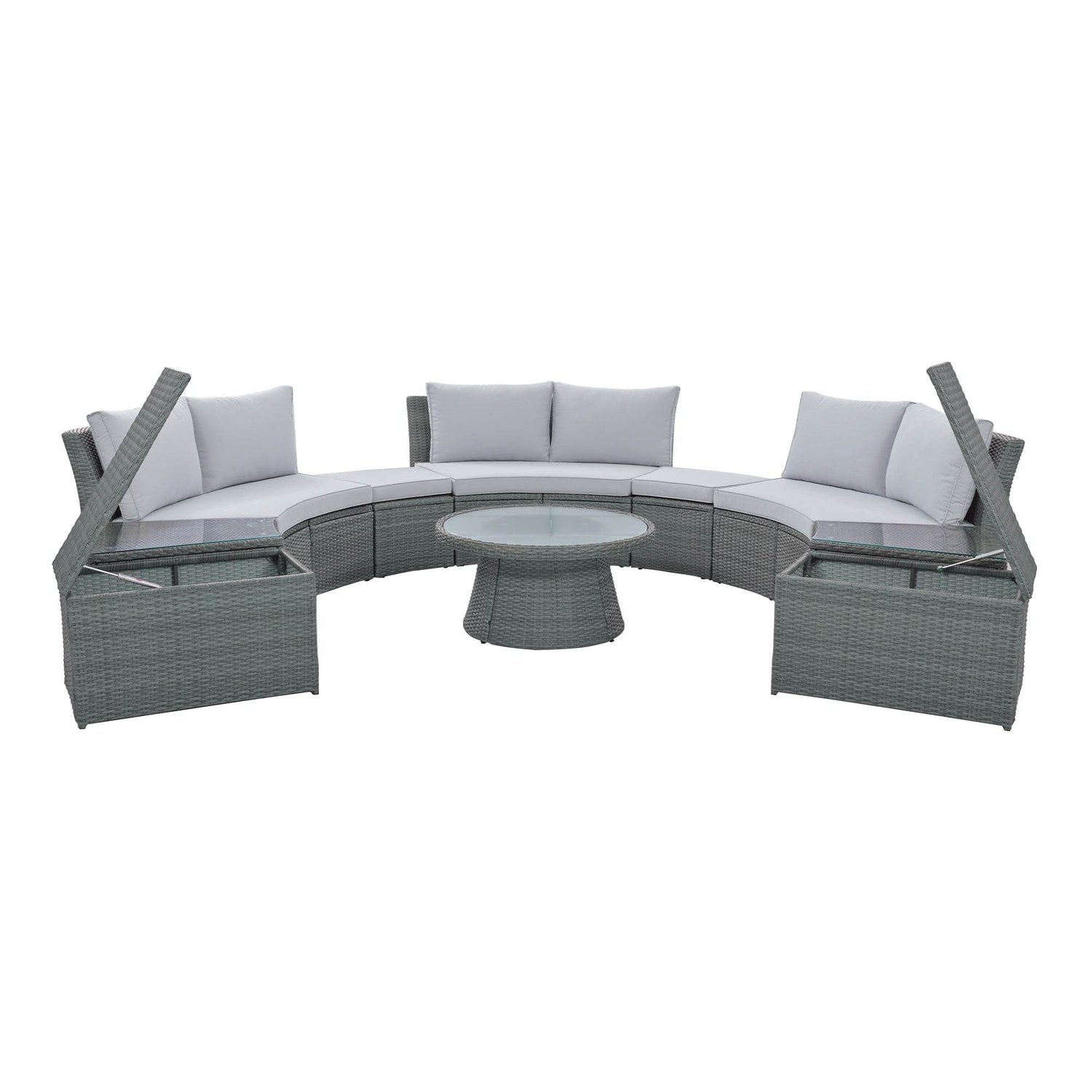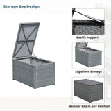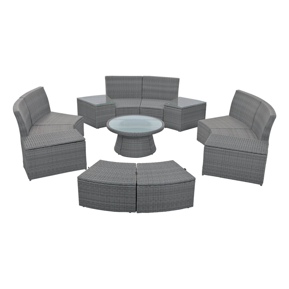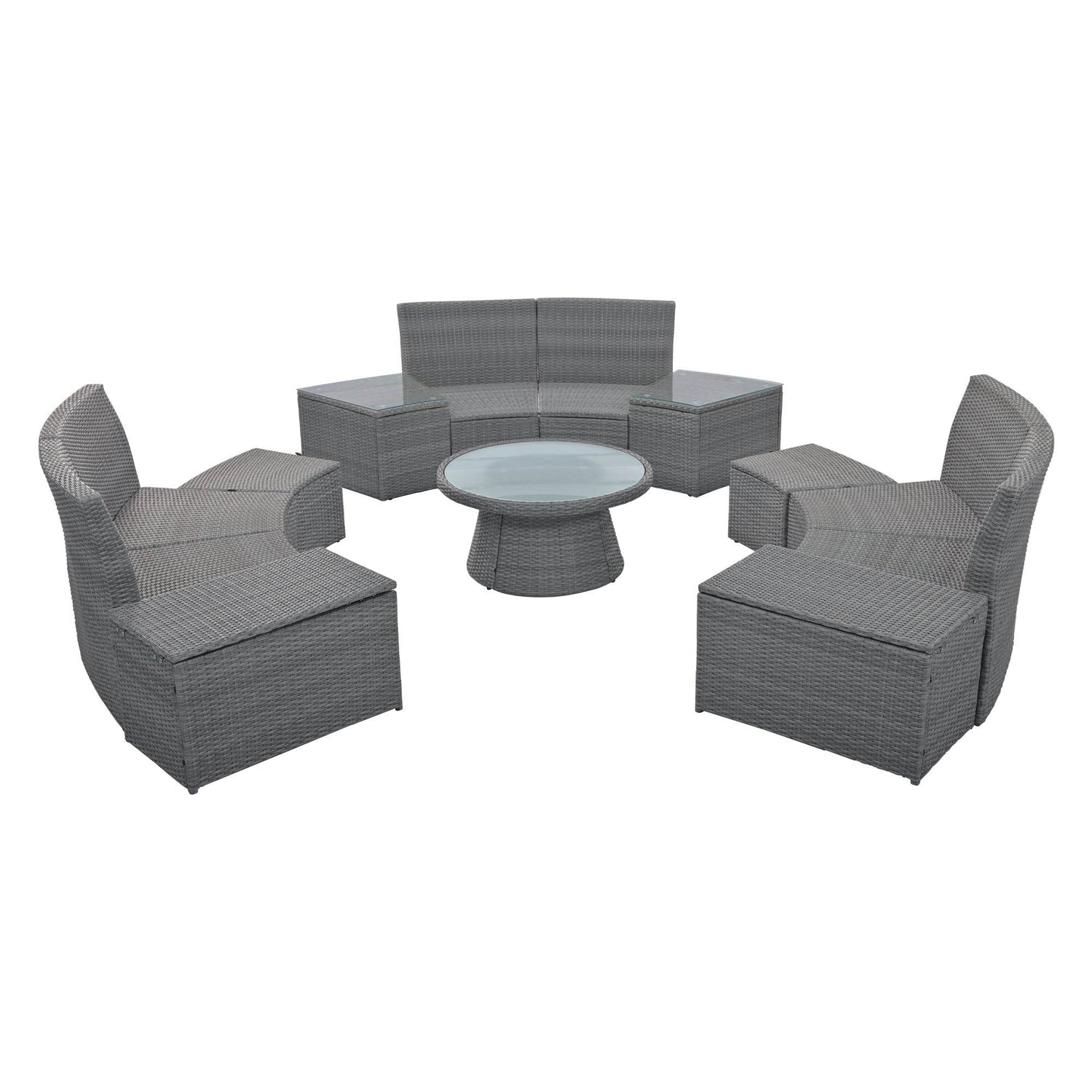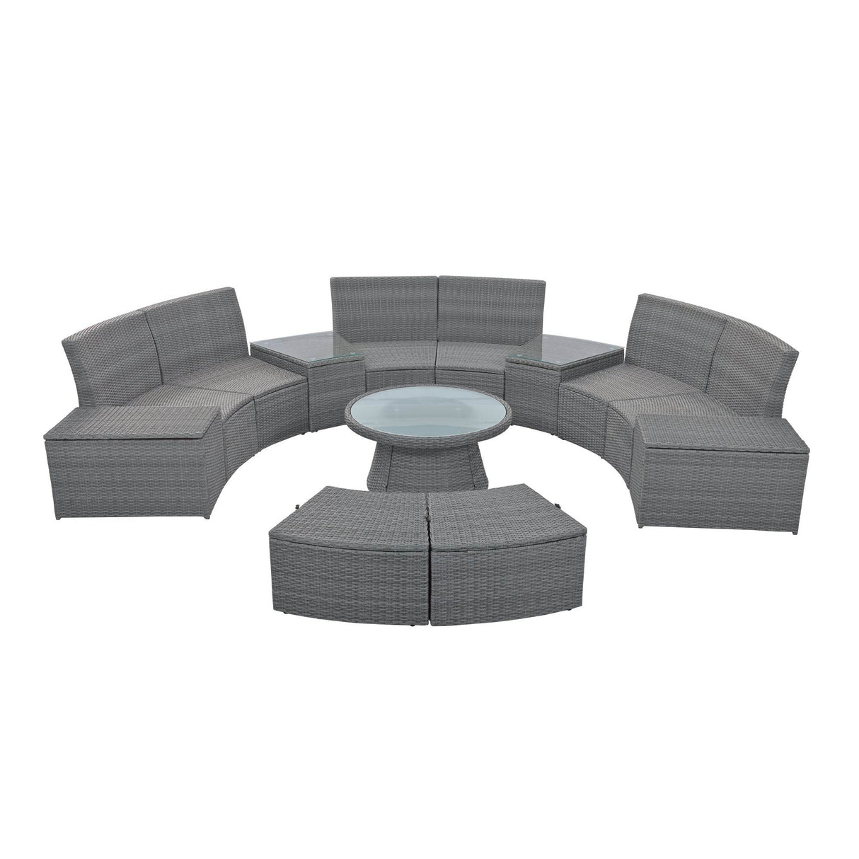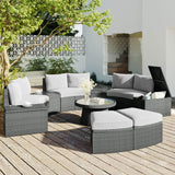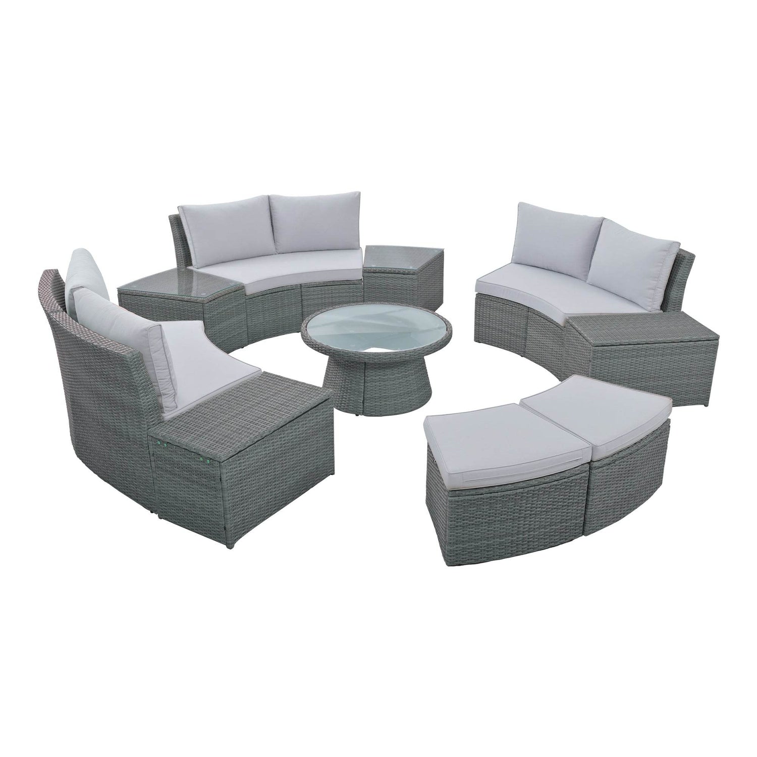 Create a welcoming outdoor living space with this versatile 10-piece patio sofa set. Crafted from durable PE wicker and solid steel frames, it delivers lasting strength and weather resistance for garden, porch, or poolside use. The light gray finish complements any outdoor decor with a modern yet casual aesthetic. Thick 3.15-inch (8 cm) foam cushions provide plush seating comfort, while the removable covers make upkeep simple. Multiple tables and storage stools add convenience for drinks, meals, and accessories, with tempered glass surfaces that wipe clean easily. Designed for free combination, each piece can be rearranged to suit your space and style, providing flexible seating for family and guests. Elevate your outdoor relaxation and social gatherings today.