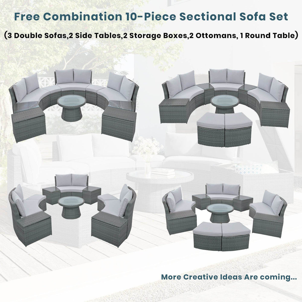 This 10-piece outdoor sectional patio sofa set features a sturdy steel frame with all-weather PE rattan and thick, water-resistant foam cushions for lasting comfort and durability. Includes multifunctional tables, storage stools, and ottomans, perfect for garden and outdoor relaxation.