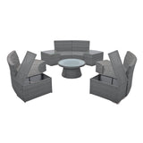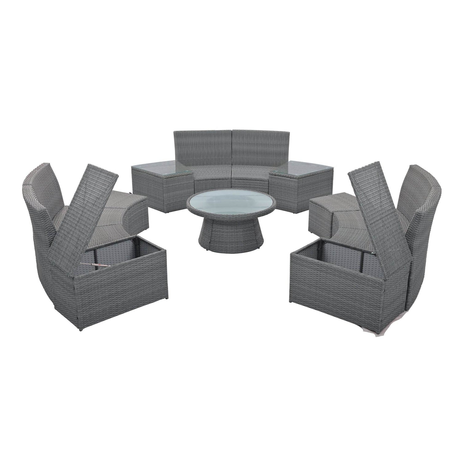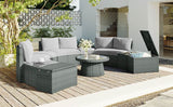 - Complete 10-Piece Set: Includes 3 loveseats, 2 side tables, 2 storage stools, 2 ottomans, 1 round table, plus 8 seat cushions and 6 back cushions.