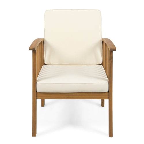Outdoor Acacia Wood patio set features durable all-weather construction with Brown Patina finish and water-resistant Cream cushions. Ergonomic club chairs offer supportive comfort with padded armrests, paired with a stylish Light Teak side table. Ideal for patios, decks, or poolside relaxation.