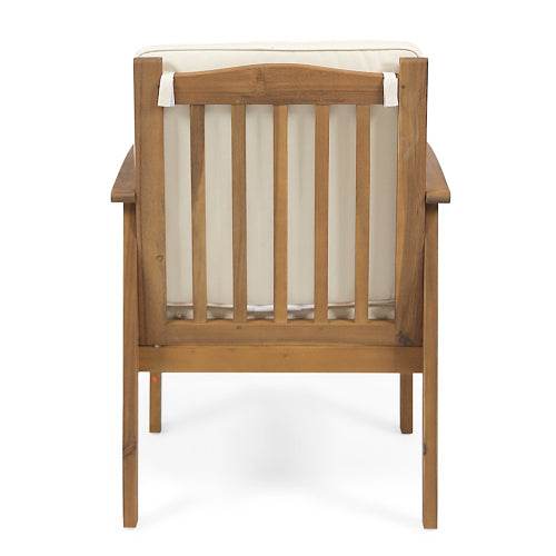 Upgrade your outdoor living space with this modern patio set featuring two Acacia wood club chairs and a coordinating side table. The rich Brown Patina finish adds timeless appeal while resisting fading, rust, and UV damage to withstand all weather conditions. Plush cream cushions crafted from water-resistant, quick-dry fabric deliver lasting comfort and are easy to maintain. Ergonomically designed armrests and high-backed chairs provide excellent support, perfect for relaxing conversations or casual dining on your patio, deck, or garden. The Light Teak side table boasts a sturdy multi-slatted design and supports up to 81 pounds, ideal for drinks or décor. Lightweight yet durable, this set combines effortless style with versatile functionality. Elevate your outdoor retreat today.