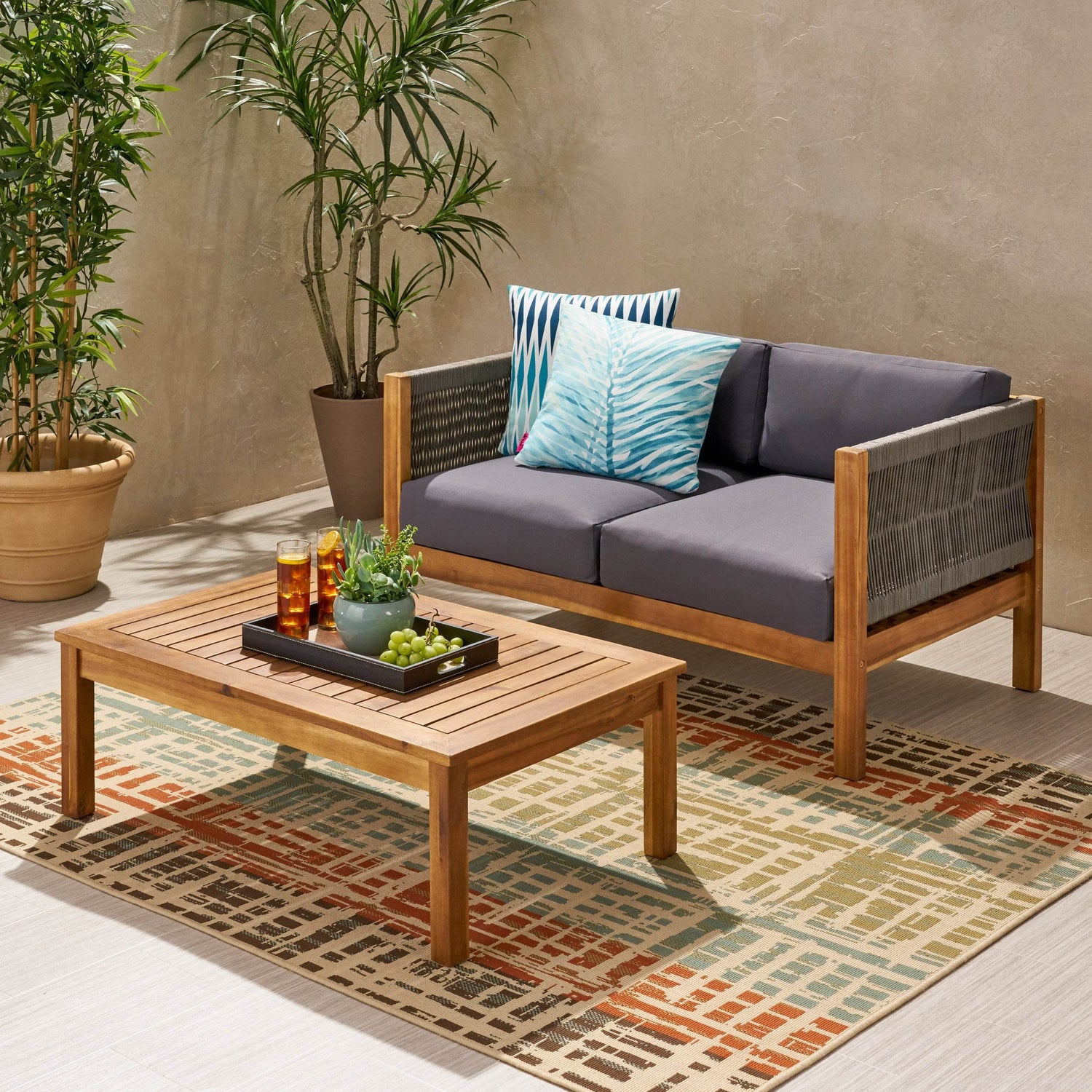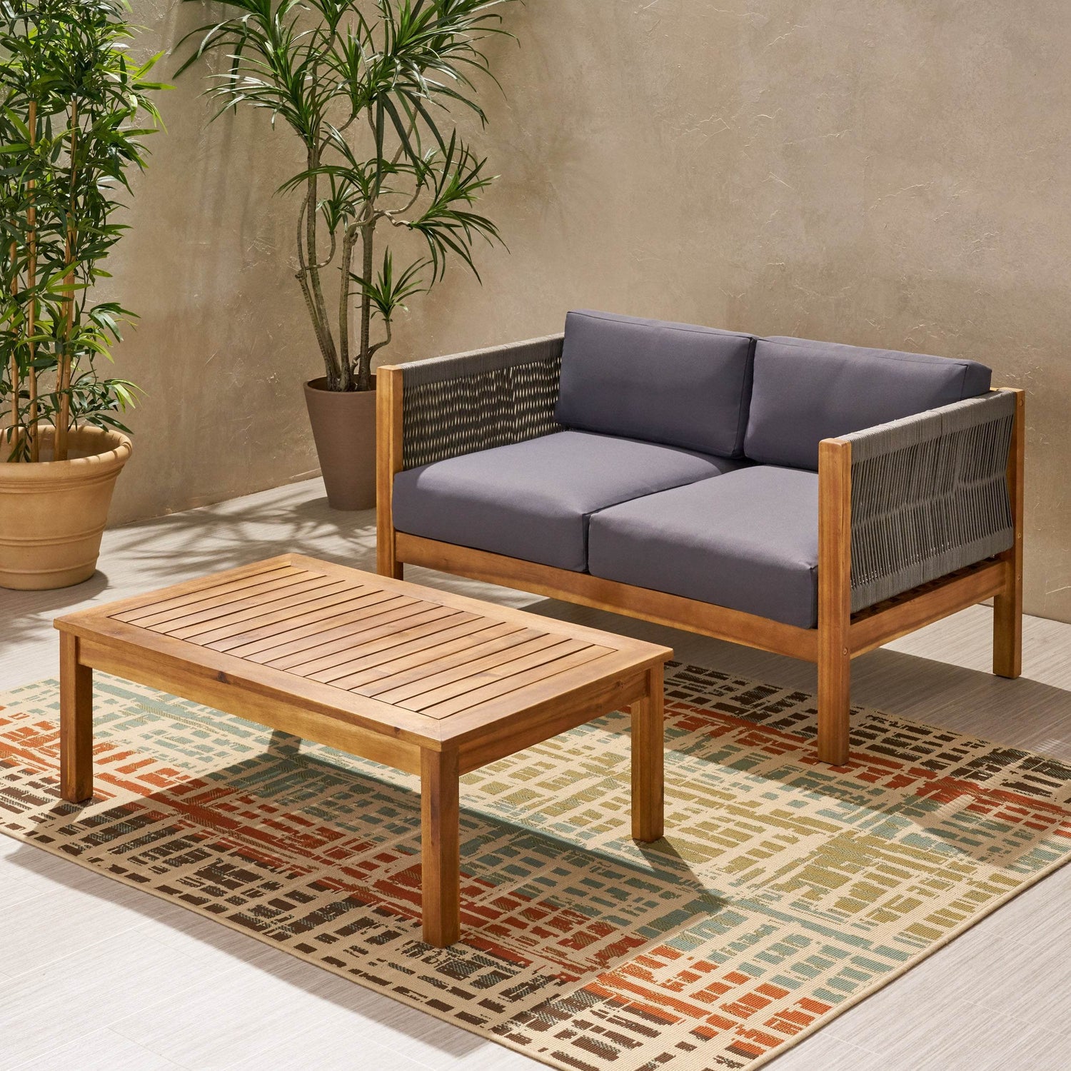 This modern patio loveseat and coffee table set features a durable acacia wood frame with intricate rattan rope weave and water-resistant cushions, offering stylish outdoor seating and easy maintenance for garden, porch, or poolside relaxation. Assembly required.