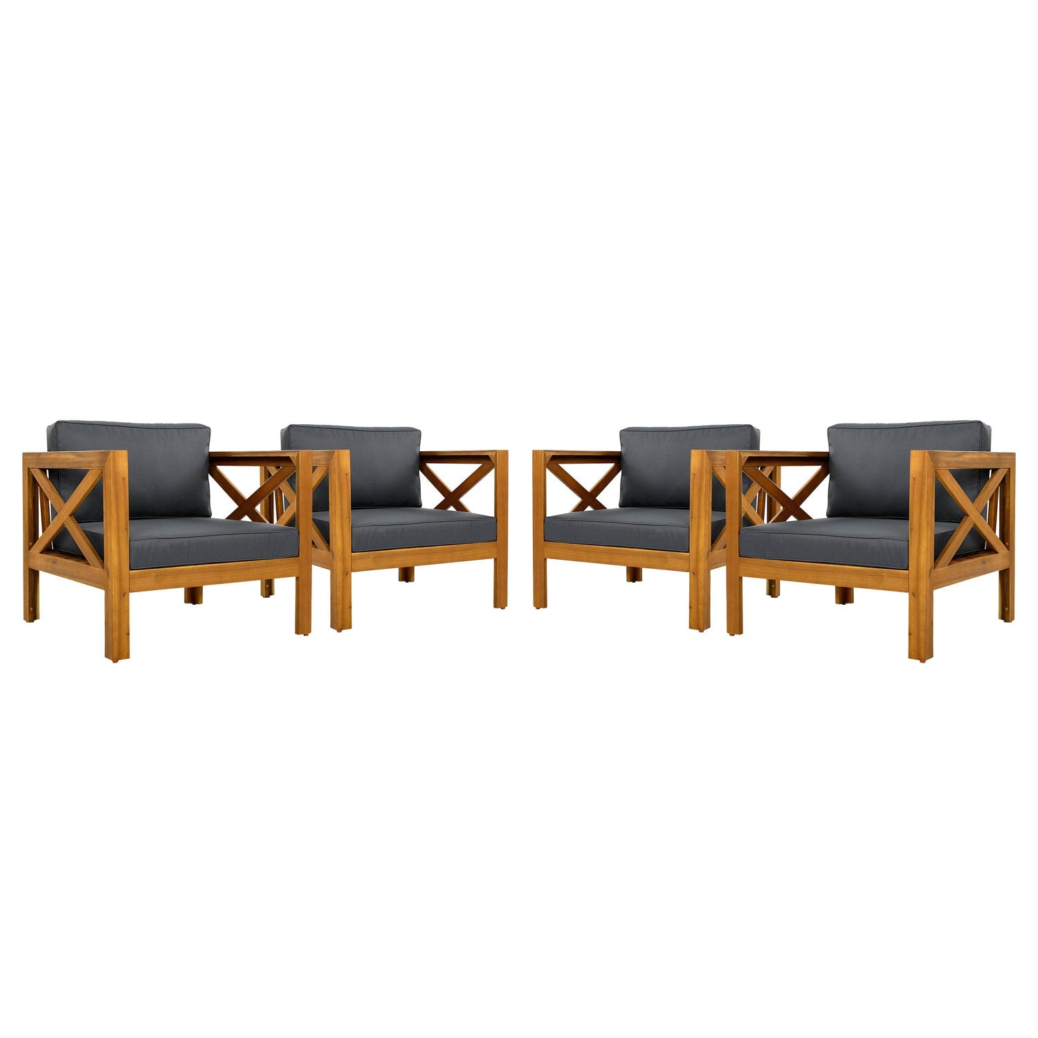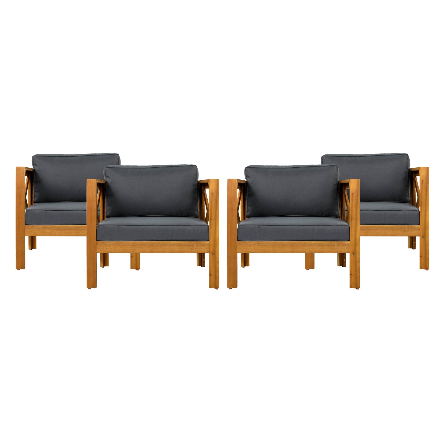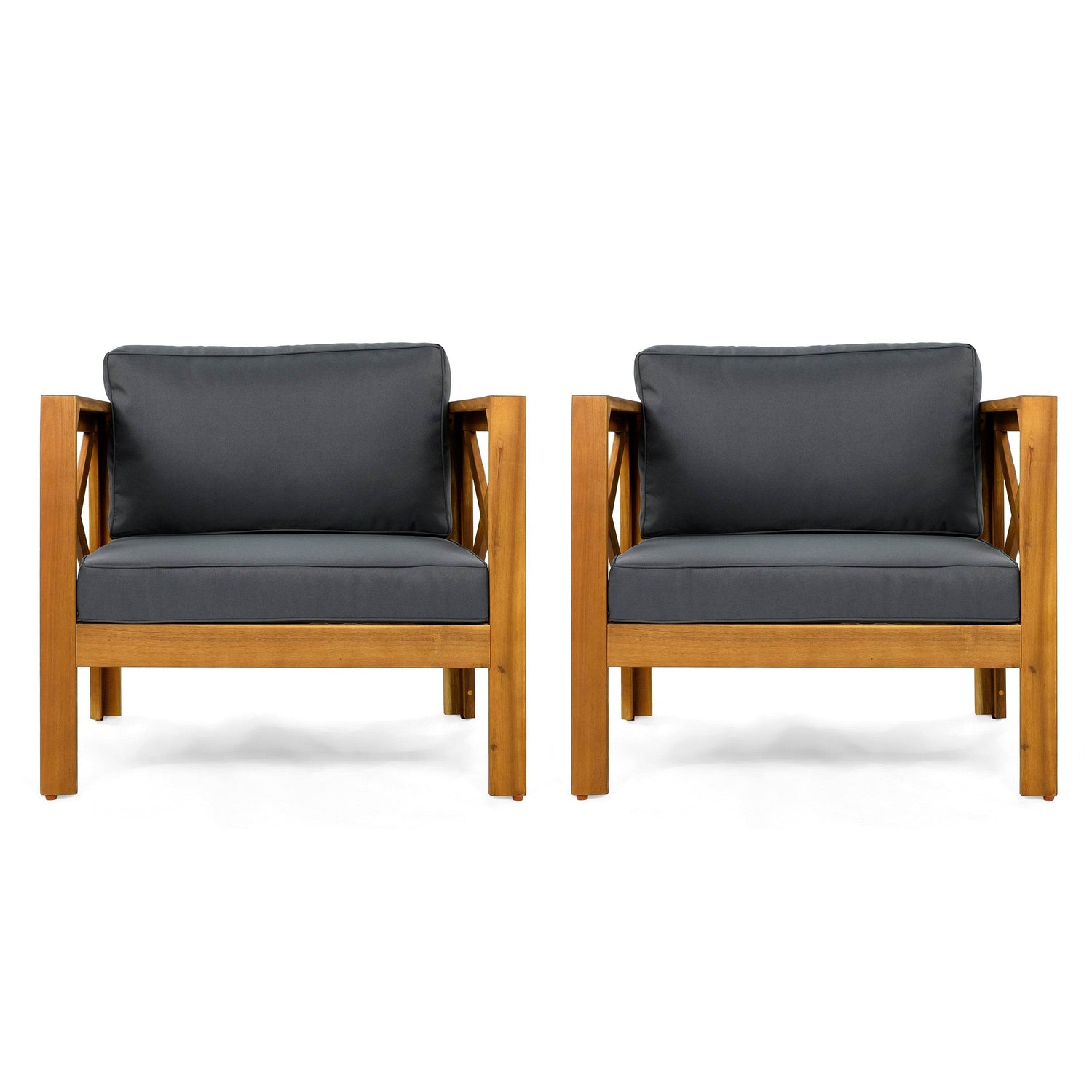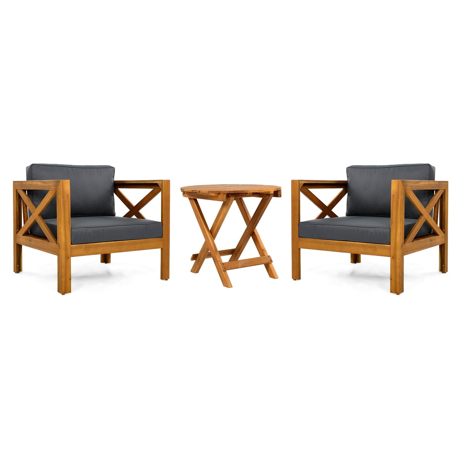 Enhance your outdoor living space with this elegant patio conversation set, featuring two sturdy Acacia wood armchairs and a foldable side table finished in classic teak. Designed for lasting durability, the set withstands all weather conditions with water-resistant fabric cushions that offer breathable, comfortable seating. Each chair’s ergonomic design supports up to 400 pounds, wrapping you in soft dark gray cushions perfect for morning coffee or evening relaxation. The foldable Acacia wood side table provides a versatile surface that folds flat for easy storage and transport, ideal for smaller patios or gatherings. Crafted with premium materials and practical features, this set transforms your outdoor area into a cozy, stylish retreat. Elevate your patio experience today.