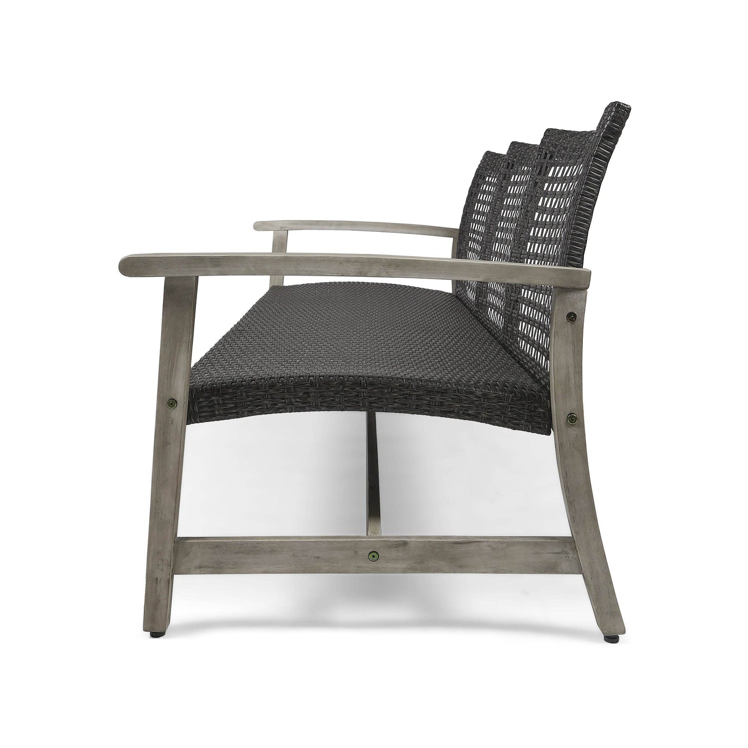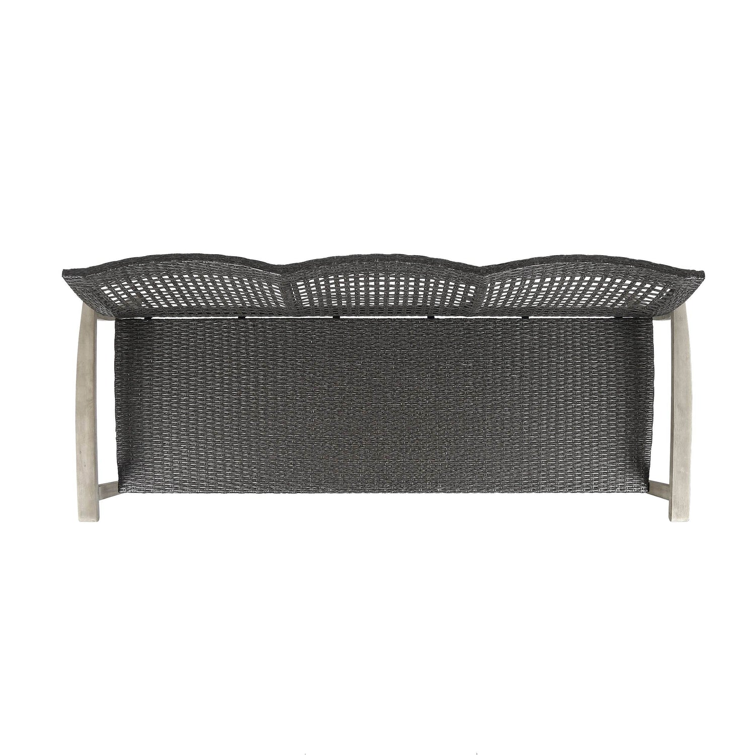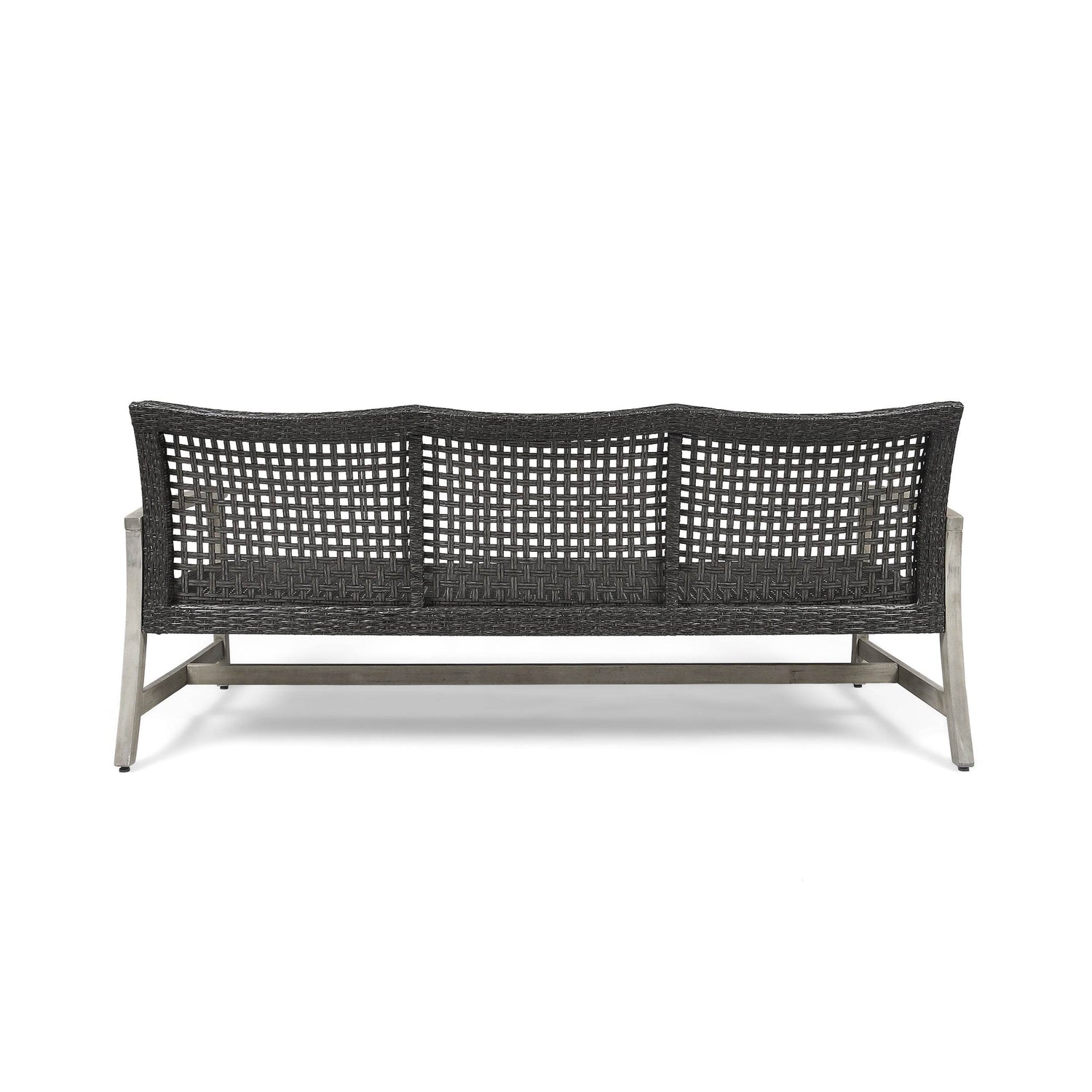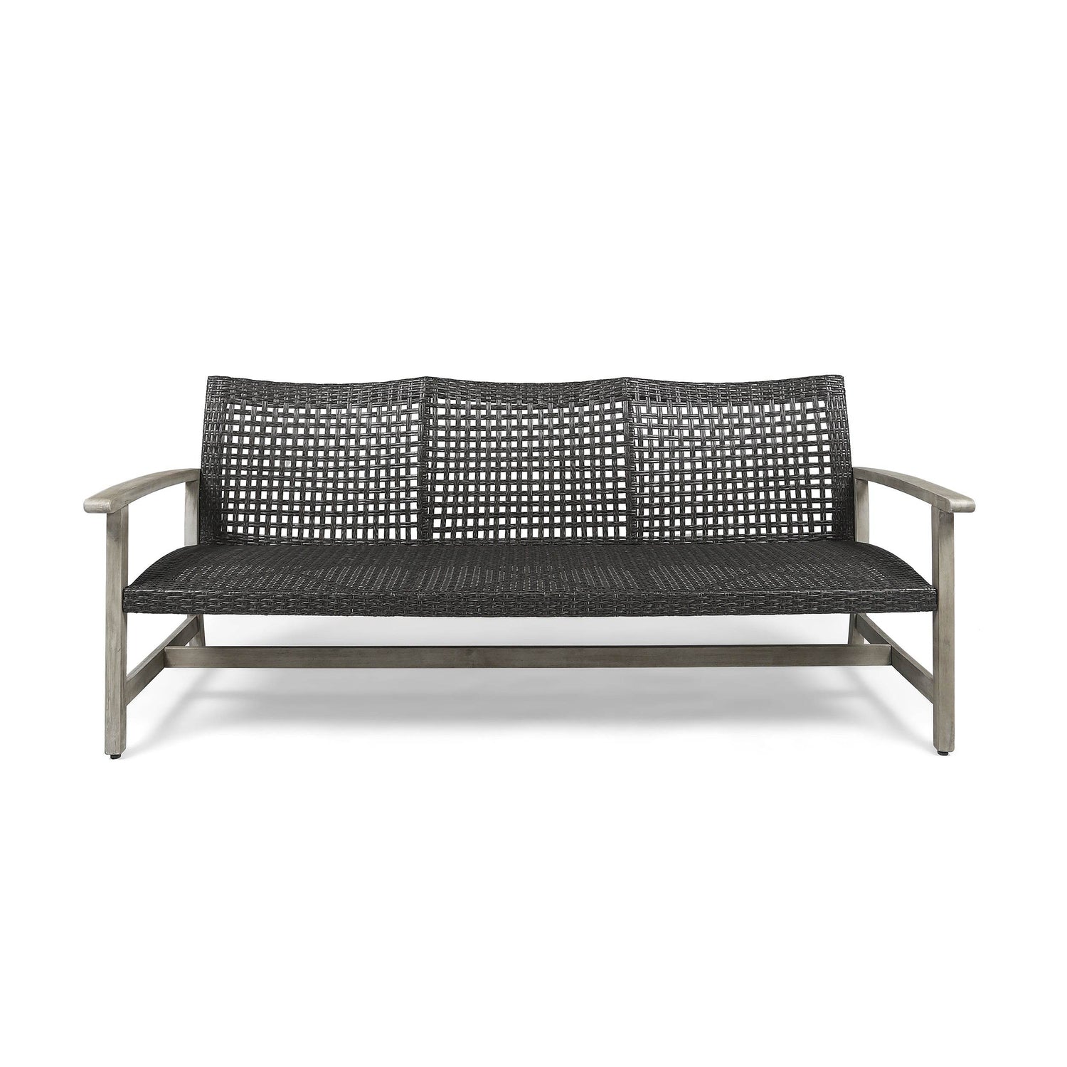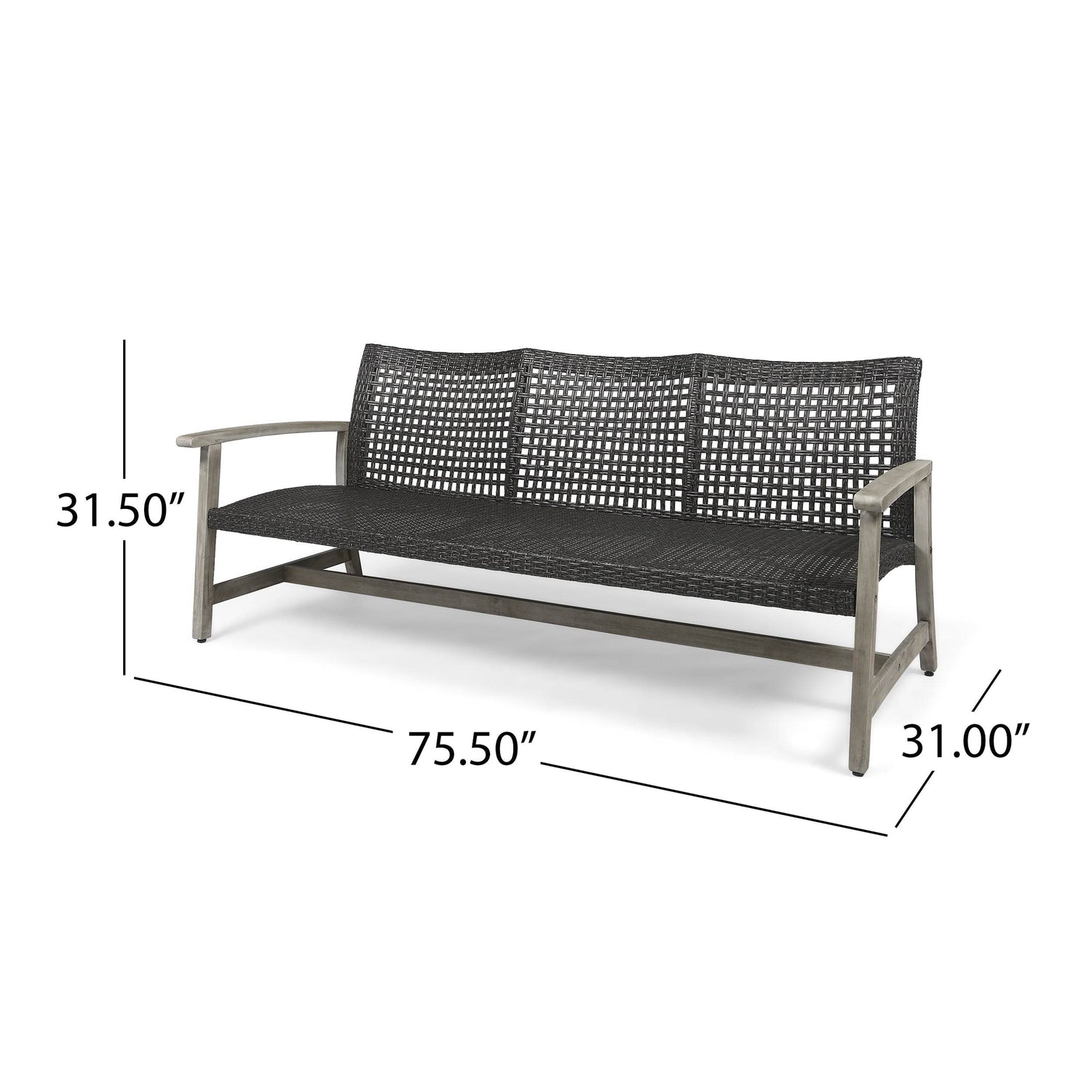 Upgrade your patio or backyard with this stylish and sturdy outdoor sofa, designed to provide comfortable seating for up to three people. Featuring handwoven grey wicker seating, this sofa offers a natural, classic look that enhances any outdoor space. Its solid acacia wood frame, complemented by iron accents, ensures long-lasting durability and weather resistance. With an assembled length of 75.5 inches and a weight of just over 44 pounds, it balances substantial build quality with easy mobility. Perfect for relaxing or entertaining guests, this sofa combines timeless design with practical comfort. Elevate your outdoor living area today and enjoy seamless relaxation in style.