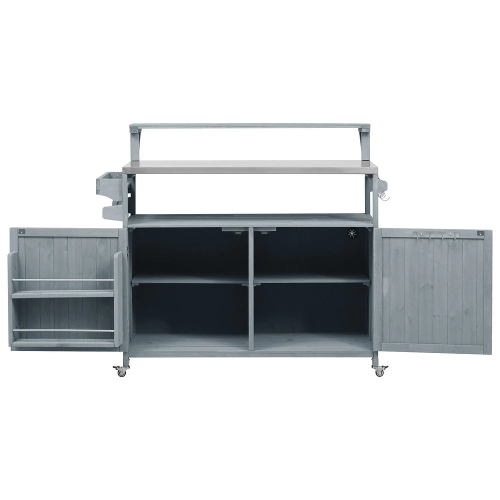 Enhance your backyard gatherings with this versatile outdoor kitchen island featuring a spacious 1.2-inch thick 201 stainless steel tabletop and a raised solid fir wood shelf for extra prep space. Crafted from FSC-certified fir wood, this grill cart combines natural durability with sleek modern design in grey and blue tones that complement any outdoor setting. Ample storage options include two cabinets with adjustable and removable shelves, an internal storage rack, spice and towel racks, and multiple metal hooks to keep grilling tools within easy reach. Four smooth 360° lockable wheels ensure effortless mobility and stability, allowing you to position your grilling station wherever you need it. Whether for BBQs, poolside parties, or outdoor kitchens, this weatherproof grill cart transforms meal prep into a convenient and enjoyable experience. Elevate your outdoor cooking setup today and impress your guests with style and functionality.