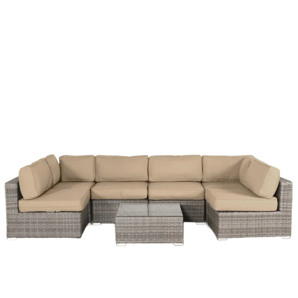 Elevate your outdoor living with this beautifully crafted 7-piece sectional seating set, designed to combine style, durability, and comfort. The spacious L-shaped sectional comfortably seats up to six people, making it perfect for garden gatherings or relaxing evenings. Each piece features handwoven beige HDPE wicker over a rust-proof aluminum frame, providing exceptional resistance to UV rays, water, rust, and mildew. Plush 5-inch thick seat cushions and supportive 14-inch tall back cushions are wrapped in fade- and water-resistant premium fabric, ensuring lasting comfort and easy maintenance. Fully assembled and ready to use right out of the box, this modern outdoor furniture set redefines effortless relaxation. Bring durable luxury and refined style to your patio today.