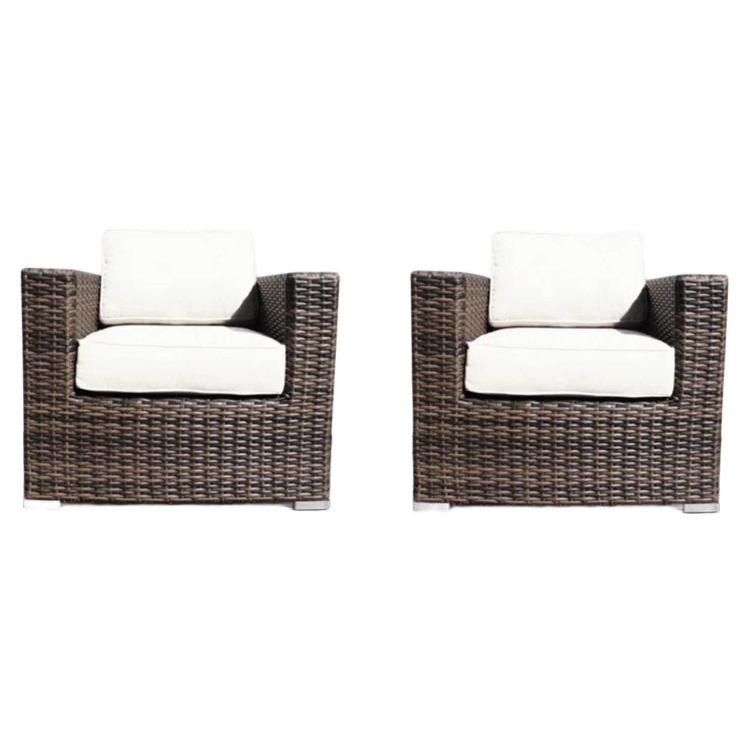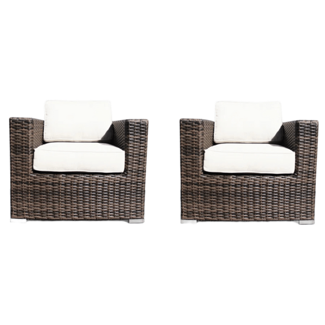 Create the perfect outdoor retreat with this set of two fully assembled patio chairs, expertly crafted for both durability and style. Featuring a lightweight, rustproof aluminum frame wrapped in handwoven, weather-resistant HDPE wicker, these chairs withstand sun, rain, and mildew while maintaining their beautiful brown mix finish. Sink into the plush, supportive cushions made from high-density open-cell foam that dry quickly and resist fading, water, and mildew. The ergonomic design with gently sloped backs and deep 28-inch seats enhances comfort for hours of lounging. Scratch-free nylon feet protect your deck or patio surface, ensuring worry-free relaxation. Ready to use right out of the box, these chairs are ideal for porches, patios, balconies, or garden spaces. Elevate your outdoor living experience today with style and comfort that lasts through every season.