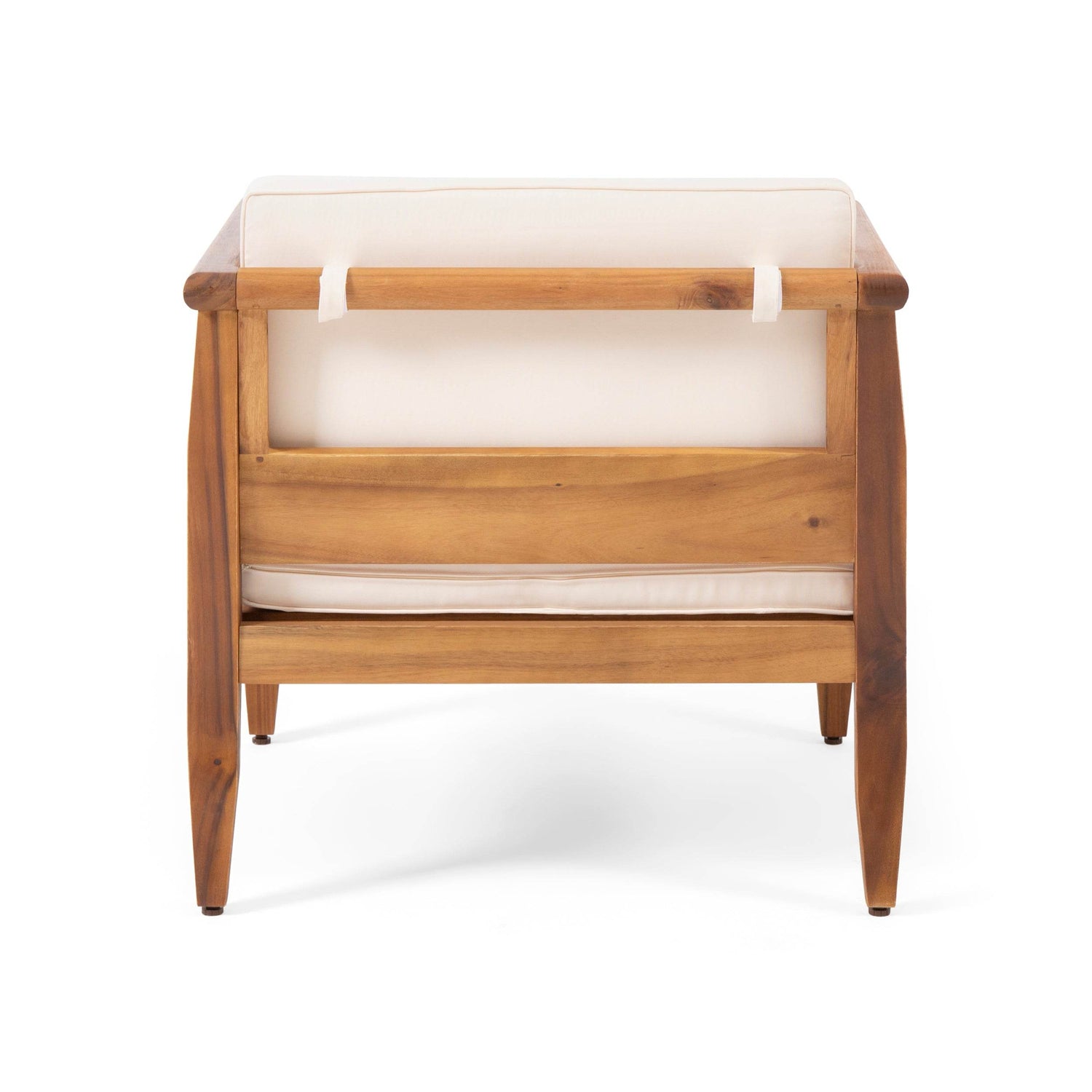 Enhance your outdoor living space with the Aston Outdoor Club Chair set, designed to bring comfort and sophistication to your patio or backyard. Crafted from durable acacia wood, these club chairs offer a sturdy yet elegant frame that naturally withstands outdoor elements. The open-slat seating and open back design provide excellent airflow, keeping you cool and comfortable while enjoying fresh air. Water-resistant cream cushions add softness and durability, making these chairs perfect for relaxing gatherings or quiet moments outside. With a sleek profile and cozy recessed arms, this pair blends function and style effortlessly. Elevate your outdoor experience with this must-have furniture set today.