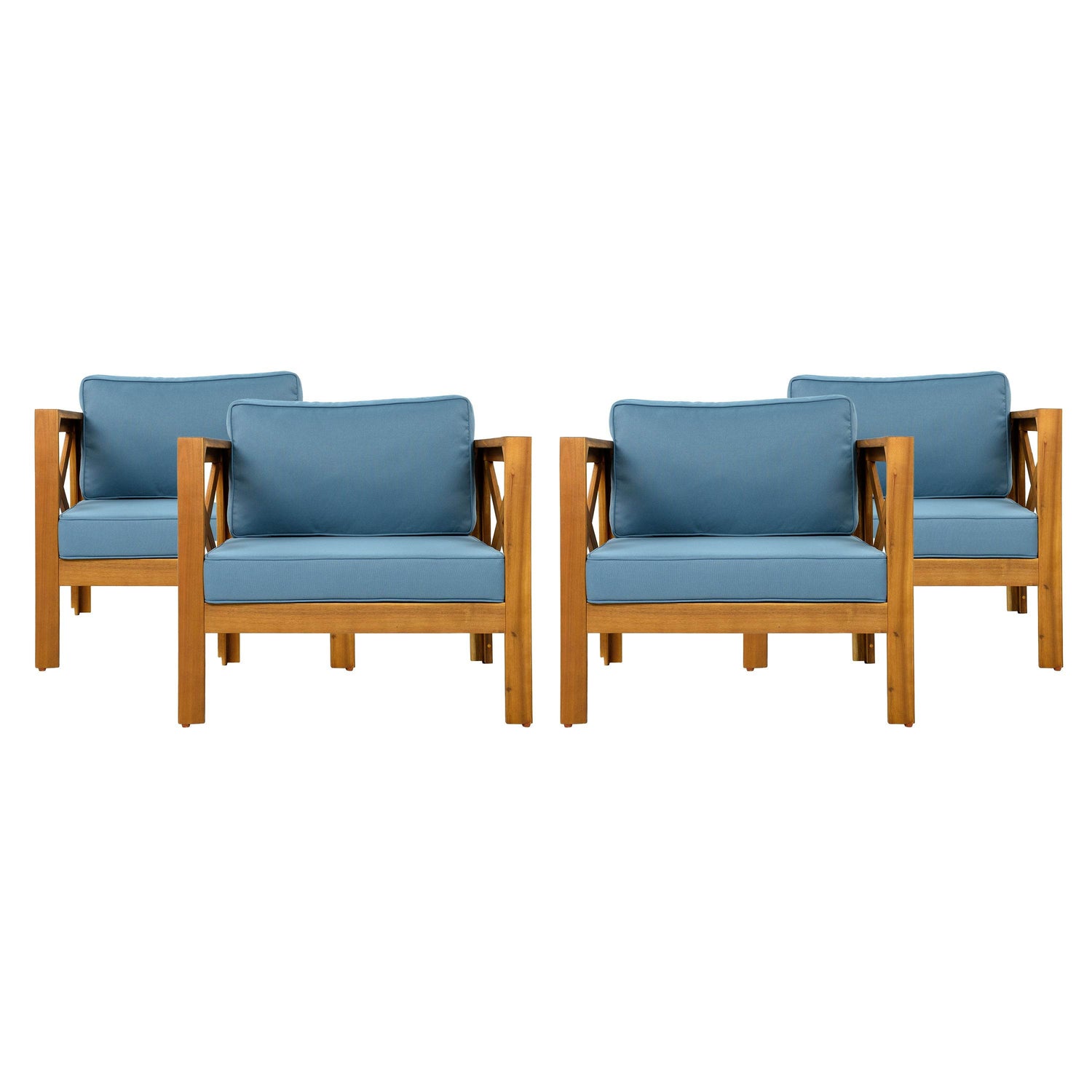 Relax in style and durability with this set of two outdoor club chairs crafted from sturdy Acacia wood finished in elegant teak. Designed to withstand the elements, each chair features a weather-resistant frame paired with plush blue cushions made from breathable, water-resistant fabric to keep you comfortable during your outdoor gatherings. The ergonomic design includes integrated armrests and a perfectly elevated seat height, ensuring cozy support for long conversations on your patio, deck, or garden. Compact yet spacious, these chairs blend classic charm with modern resilience, elevating any outdoor living space. Easy to assemble and maintain, the set offers lasting comfort and style for your favorite relaxation moments. Elevate your outdoor seating experience today.