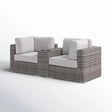 Handwoven HDPE wicker outdoor loveseat seats two with weather-resistant aluminum frame, plush water-resistant cushions, ergonomic sloped back, and built-in cup table. Removable, washable olefin covers ensure easy care. Ideal for patios and gardens, no assembly required.