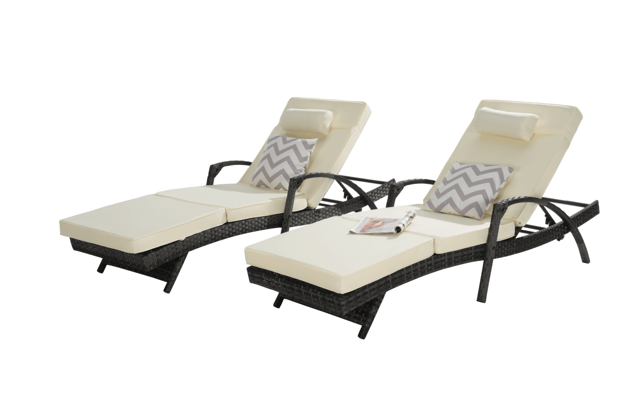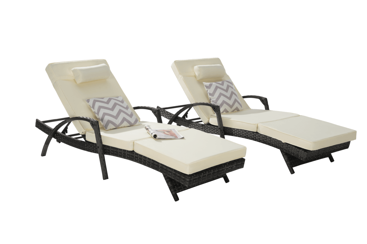 This outdoor wicker reclining lounge chair set includes two weather-resistant loungers with adjustable backrests, durable rattan and steel frames, and water-resistant polyurethane cushions. Ergonomic wave design offers lasting comfort for patios, poolsides, or garden relaxation.