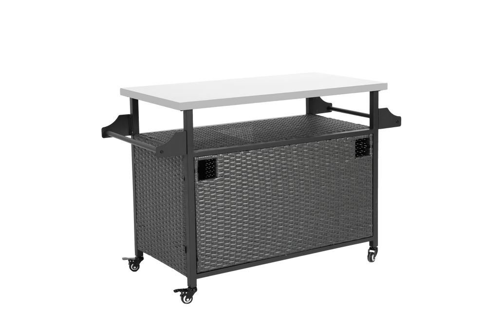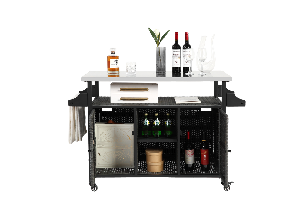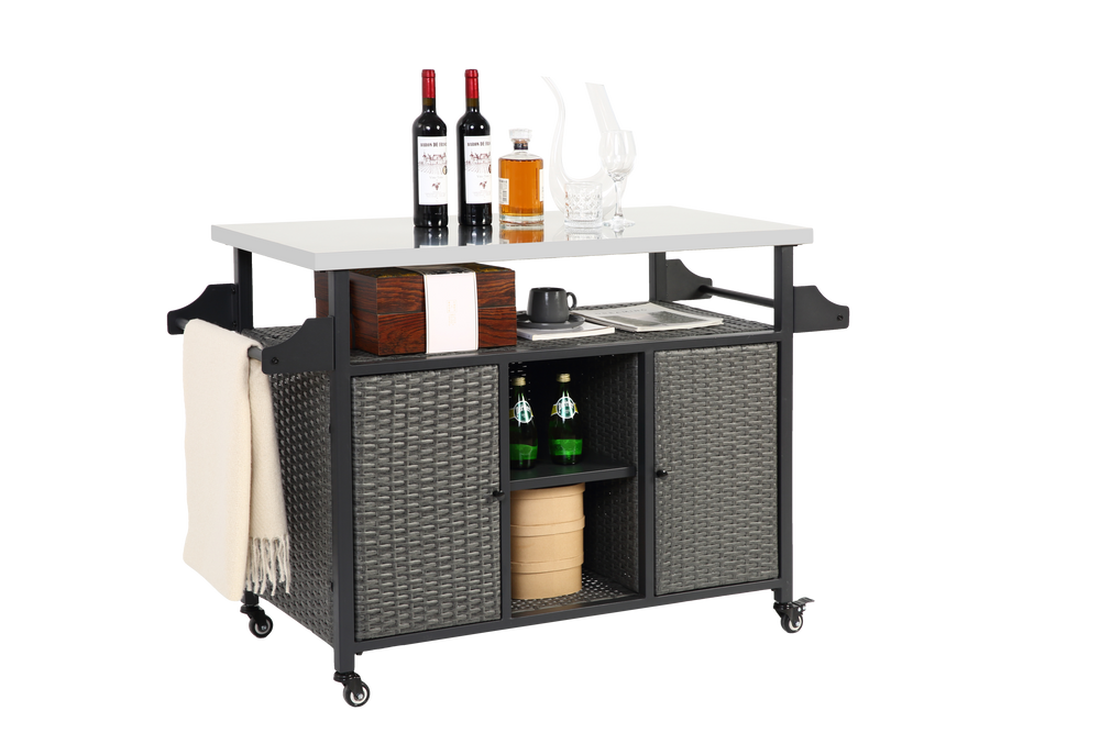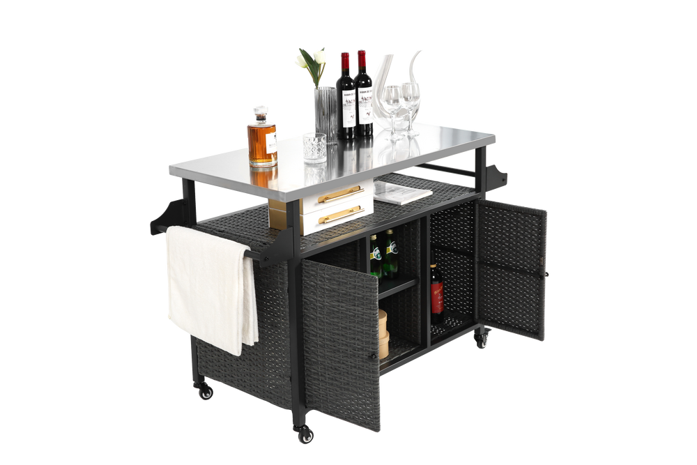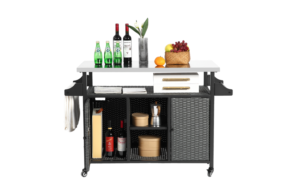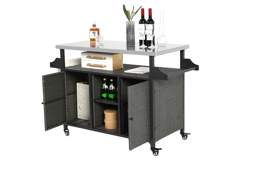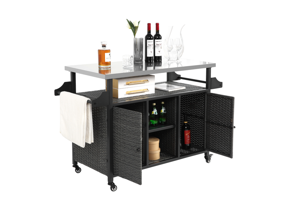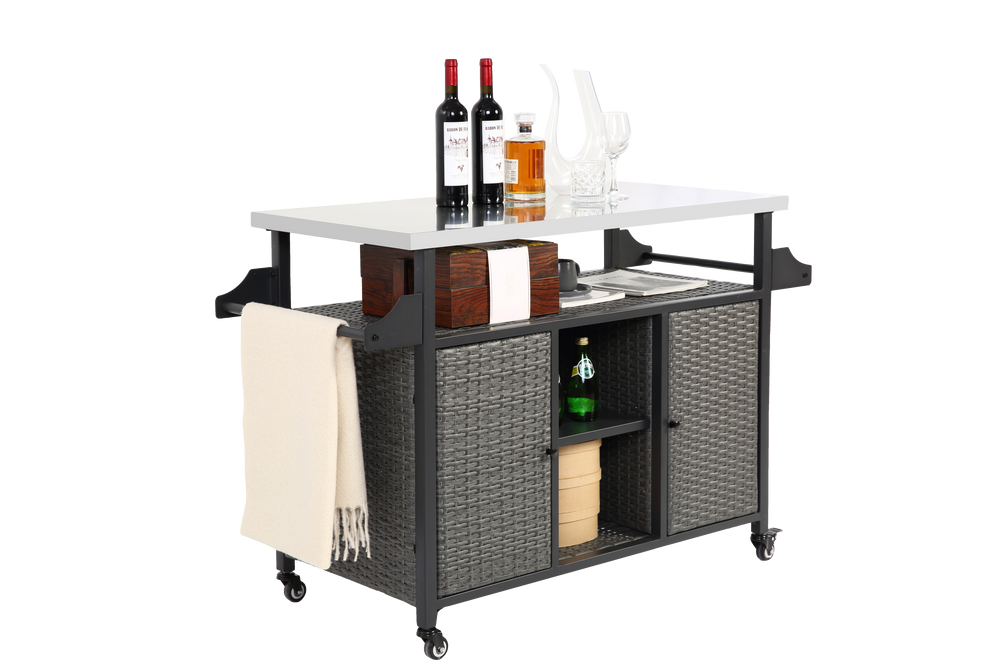 Enhance your garden, patio, or outdoor kitchen with this large bar cart featuring a stylish grey wicker design and robust steel frame. Designed for seamless mobility, the rolling cart includes smooth-rolling wheels and a convenient side handle, making it easy to serve drinks and snacks wherever you need. The stainless steel tabletop with an expandable panel provides ample prep space that's easy to clean, while multiple storage options—including open shelves, a spacious cabinet, a large drawer, and a wine glass rack—keep all your essentials organized. Additional practical features like a paper towel holder and bottle opener streamline your outdoor gatherings. Built to withstand outdoor elements with durable materials and craftsmanship, this versatile bar cart combines functionality and style for effortless entertaining. Elevate your outdoor space today.