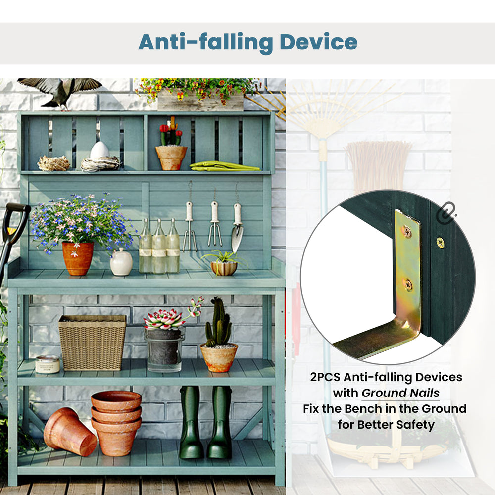 Farmhouse-style wooden potting bench features a spacious 46.8x18.5-inch workstation, four storage shelves, splash plate, and side hooks for organized garden tool storage. Designed for outdoor use, it enhances gardening efficiency and safety with an anti-falling device.