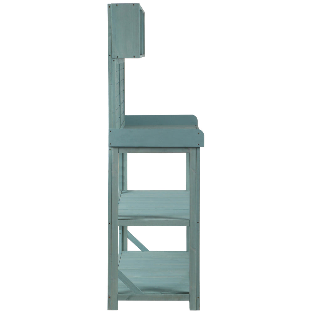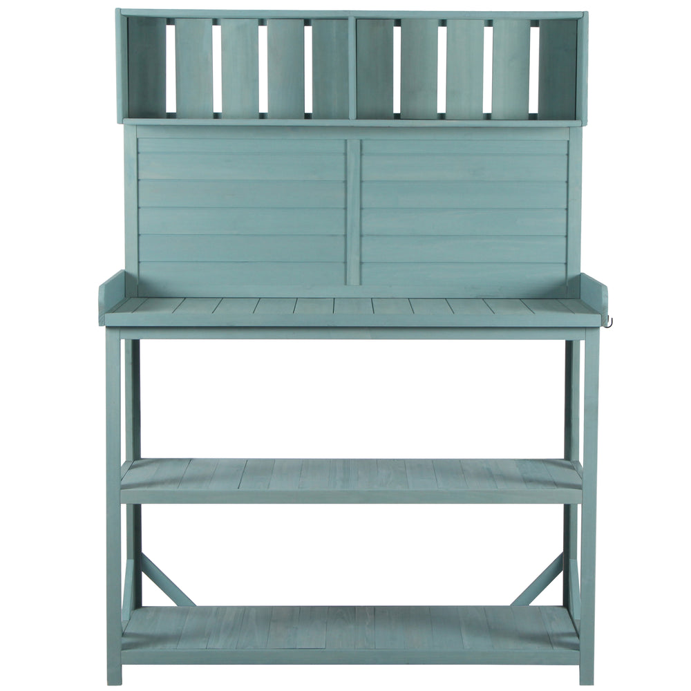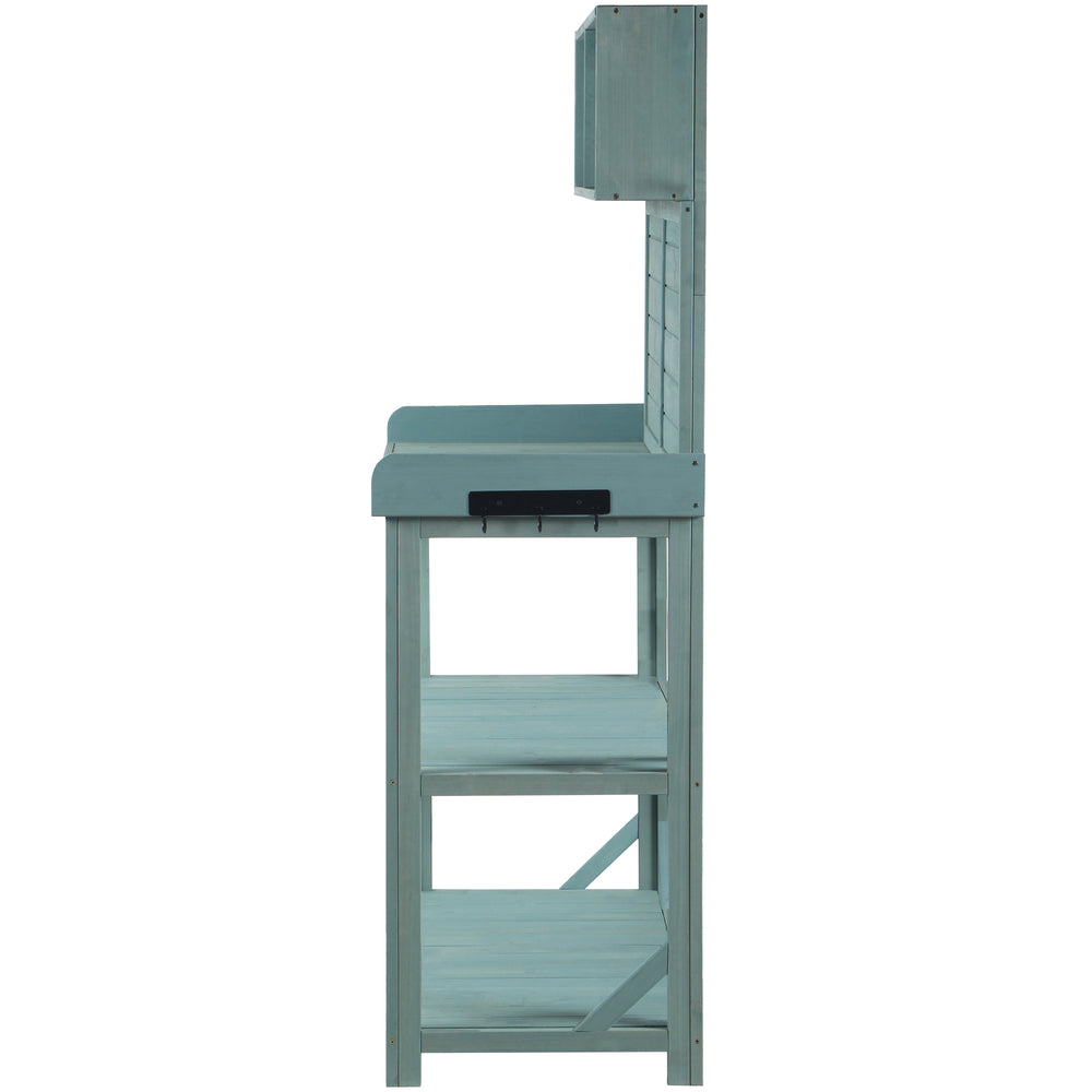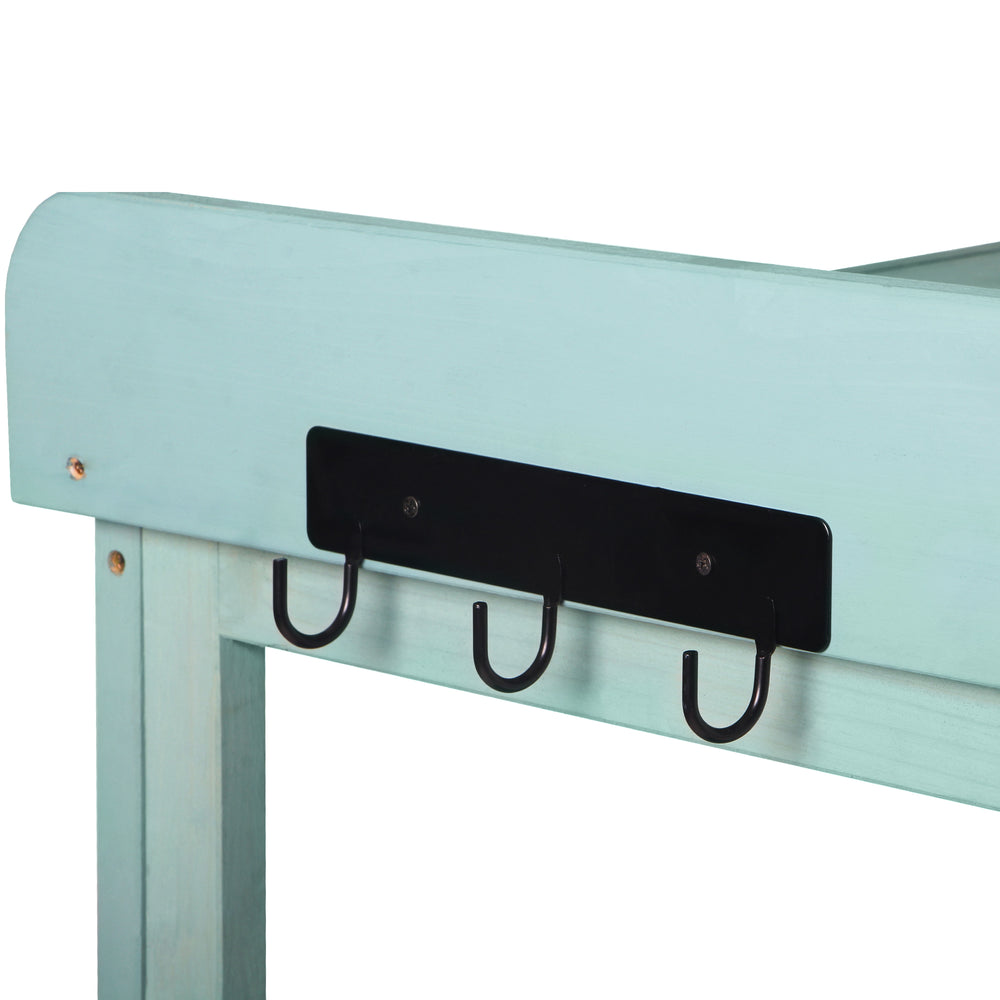 Bring rustic charm and practical functionality to your outdoor space with the TOPMAX 65-inch Wooden Potting Bench. Crafted from sturdy fir wood and finished in a fresh green tone, this farmhouse-style garden workstation offers a spacious 46.8 x 18.5-inch surface perfect for potting, planting, and organizing your garden essentials. Designed with comfort in mind, the 65-inch height prevents unnecessary bending. Four generous storage shelves keep your tools, soil, pots, and other supplies within easy reach, making gardening efficient and enjoyable. The included splash plate and side hooks provide added convenience for hanging hand tools and gloves. Built with safety features like ground-fixing anti-falling devices, this bench remains secure even on uneven terrain. Whether you’re a seasoned gardener or a weekend hobbyist, this durable outdoor potting bench invites productivity and style. Elevate your gardening experience today.