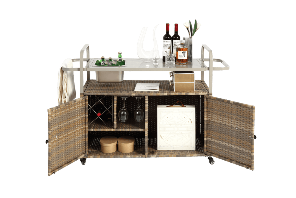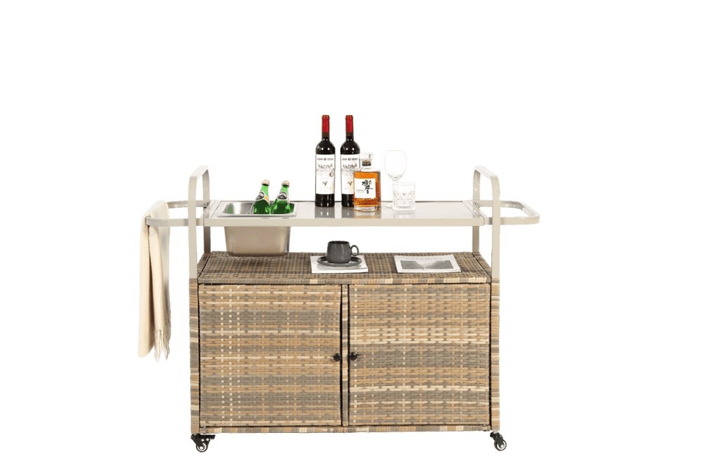 Designed for effortless outdoor entertaining, this Beige Outdoor Bar Table combines functionality with durable style. Featuring a powder-coated steel top and a breathable PE rattan wicker cabinet, it offers both weather resistance and elegant charm for your garden, poolside, or backyard. Equipped with four 360-degree lockable wheels, this portable bar cart moves smoothly to wherever you need it, simplifying setup for parties, BBQs, or casual lounging. The multifunctional side basket and built-in ice bucket keep refreshments and essentials close at hand, while the sturdy frame supports up to 154 pounds for stable service. Easy to assemble and maintain, this patio serving cart is the perfect combination of convenience and all-weather durability. Elevate your outdoor gatherings today with this stylish and practical bar cart.