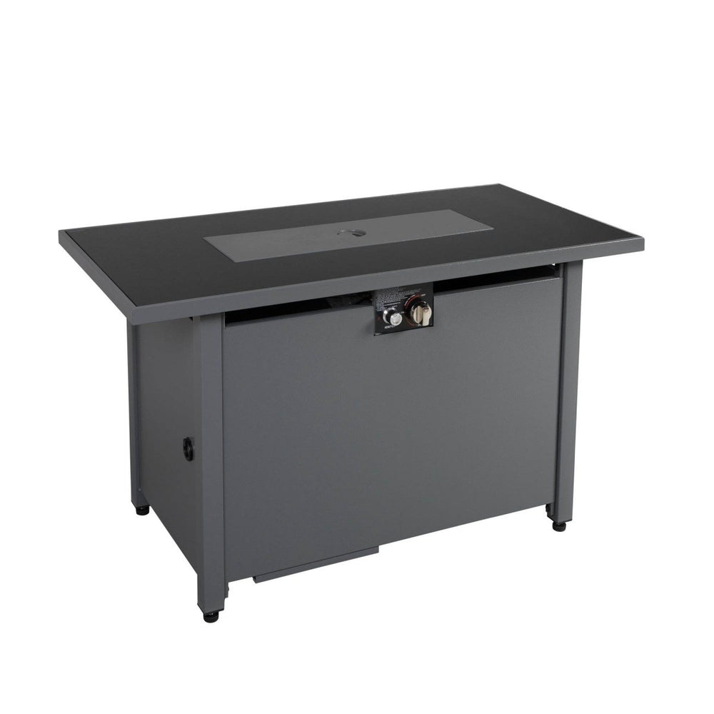 Bring warmth and modern style to your patio or backyard with this durable Steel Outdoor Fire Pit Table. Featuring a sleek black powder-coated steel frame and a heat-resistant smoked glass top, it combines functionality with contemporary design. The powerful 50,000 BTU output and adjustable push-button ignition system let you control the flame effortlessly, creating a cozy ambiance for gatherings or relaxing evenings. Its concealed fuel tank maintains a clean, streamlined look, while the included fire bowl and safety glass shield enhance durability and protection. Designed specifically for outdoor use, this fire pit table withstands heat and rust, making it an ideal centerpiece all year round. Add versatility with propane or convert it to natural gas (conversion kit sold separately). With dimensions of 25 inches high, 42 inches wide, and 22 inches deep, this fire pit provides ample surface area for entertaining. Elevate your outdoor relaxation and style today.