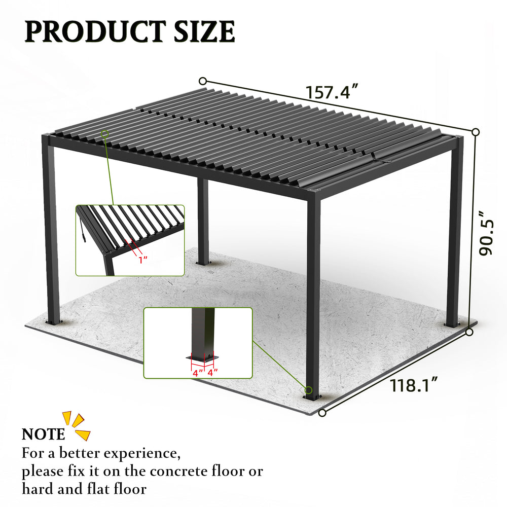 Create the perfect garden or backyard retreat with this durable 10x13-foot louver pergola. Crafted from powder-coated aluminum, it offers exceptional high wind resistance and weather durability for year-round outdoor enjoyment. The innovative adjustable louver roof allows you to control sunlight and ventilation effortlessly using a simple crank, providing shade on sunny days and open-air comfort when desired. Integrated drainage ensures rainwater is efficiently diverted away, keeping your space dry and comfortable. Weighing approximately 325.5 pounds, this pergola measures 157 inches long, 118 inches wide, and stands 90.5 inches tall, making it an ideal centerpiece for parties, BBQs, or quiet relaxation. Easy to assemble with prefabricated parts and expansion bolts, it transforms any outdoor area into a stylish, functional oasis. Elevate your outdoor experience today.