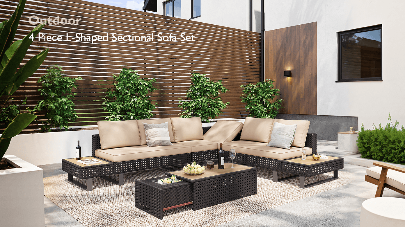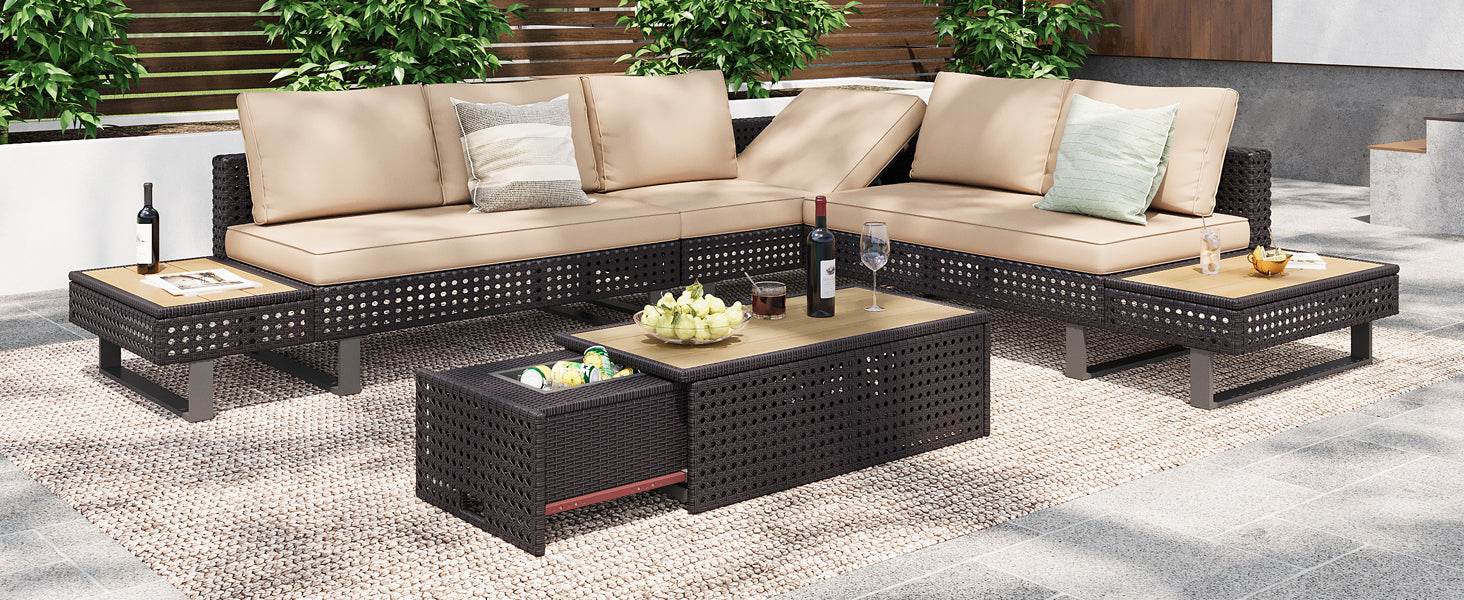 Elevate your outdoor living with this sophisticated 6-piece patio sectional featuring a classic diamond weave design in warm khaki and brown tones. Crafted from weather-resistant galvanized steel and hand-woven UV-rated wicker, this modular set offers enduring durability and style through all seasons. Plush foam cushions wrapped in soft, water-repellent polyester provide deep seating comfort, while the three-level adjustable reclining backrest lets you find your perfect lounging angle. The extendable poly-wood coffee table includes a built-in foldable ice bucket, ideal for keeping refreshments chilled during gatherings. Designed for flexibility, the sectional pieces can be effortlessly arranged to suit your outdoor space and even transform into a cozy bed. Easy to assemble and maintain, this set brings both function and modern farmhouse elegance to your porch, backyard, or garden. Elevate your relaxation today with durable, stylish outdoor furniture that welcomes you and guests to unwind in comfort.
