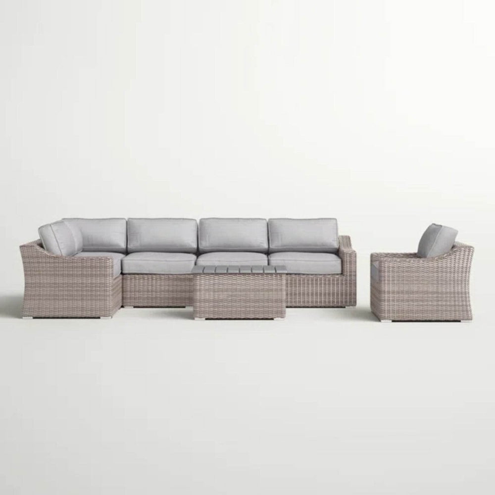 Bring style and relaxation to your outdoor living space with this 7-piece all-weather wicker sectional seating group. Designed to comfortably seat five, this set features a spacious L-shaped sectional, a cozy club chair, and a slatted coffee table, perfect for entertaining friends or enjoying quiet moments. Crafted with a robust aluminum frame wrapped in weather-resistant gray wicker, it promises durability and lasting beauty year-round. Plush gray olefin cushions with foam fill provide superior comfort and support, while their removable, machine-washable covers make upkeep easy. Fully assembled and ready to elevate your patio, this sectional combines modern design with practical functionality for the perfect backyard retreat.