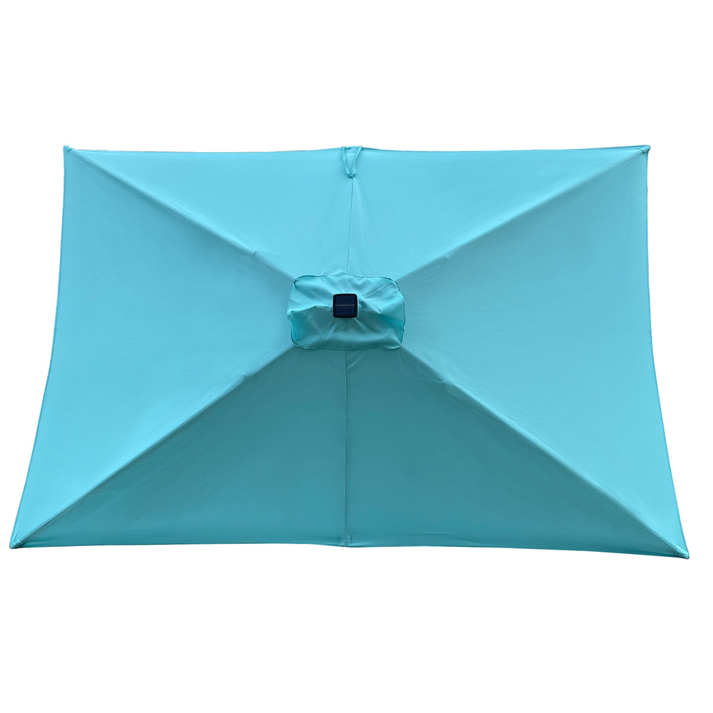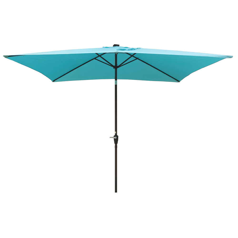 This turquoise rectangular patio umbrella features a durable steel frame and a waterproof, fade-resistant polyester canopy with 26 solar-powered LED lights lasting 6–8 hours. It offers easy crank lift and push-button tilt, ideal for backyard, garden, or poolside relaxation.