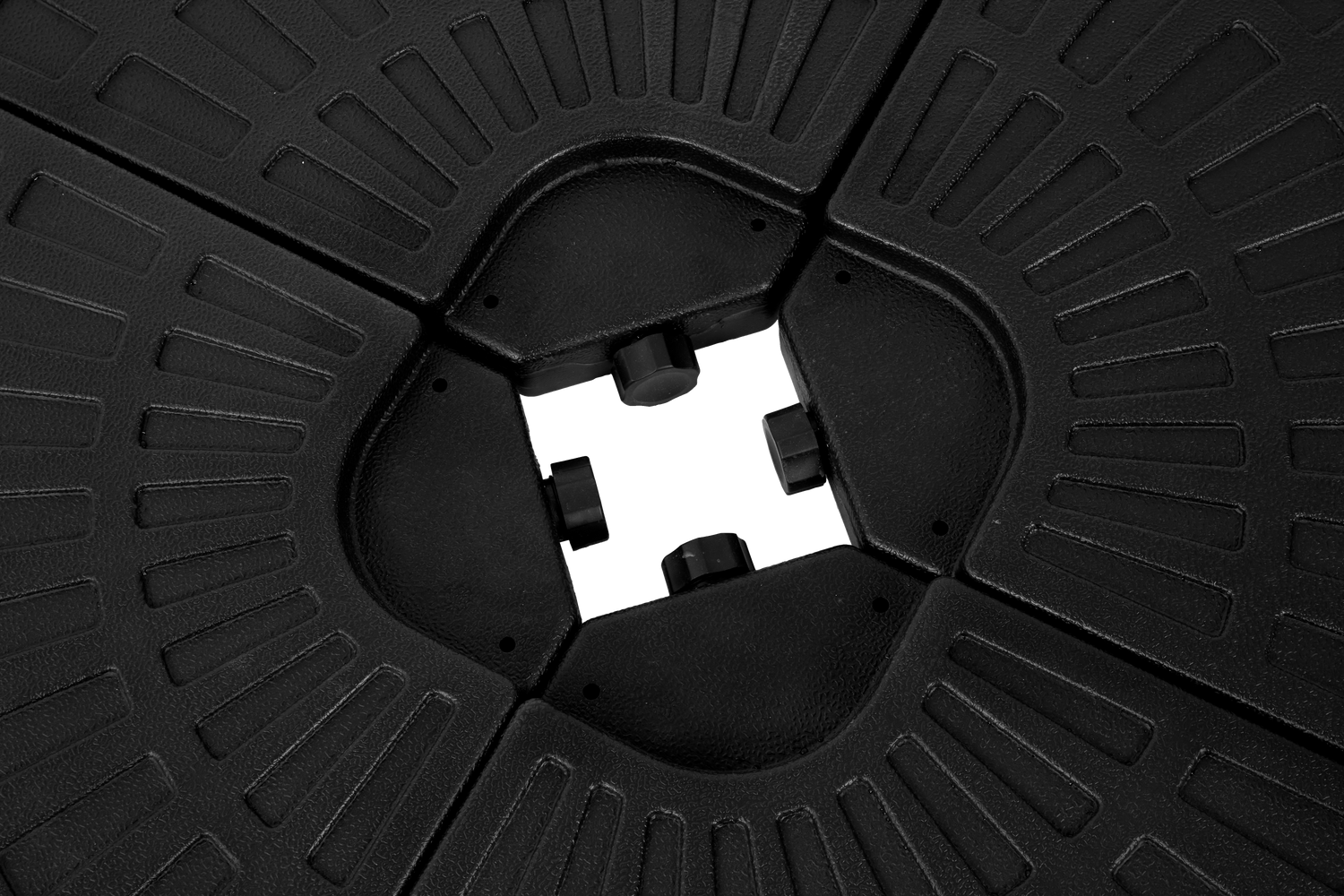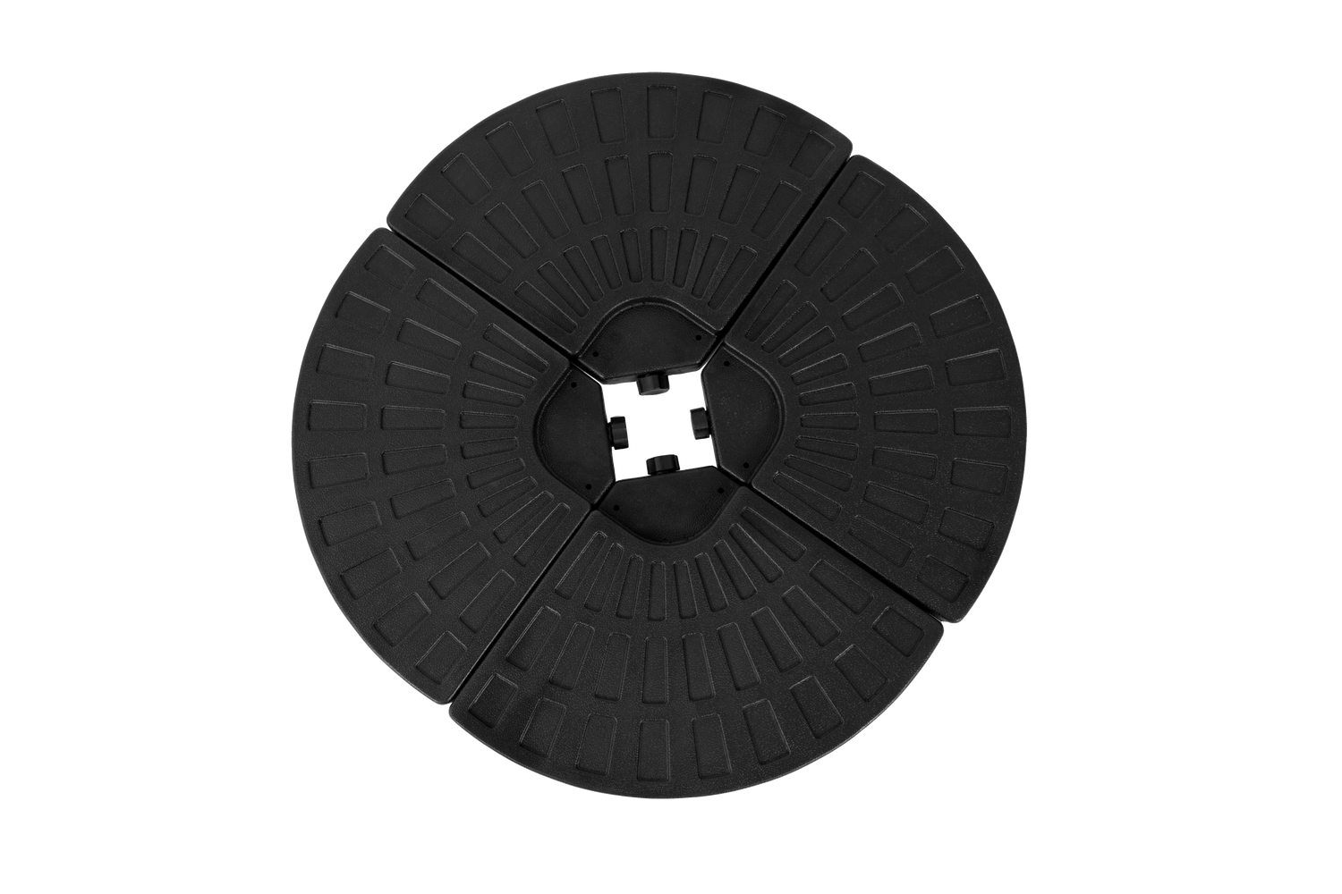 Durable black plastic umbrella base features a sturdy four-plate design with detachable weight plates that can be filled with sand or water up to 42 pounds each, ensuring stable support for most cantilever offset patio umbrellas and lasting weather resistance.