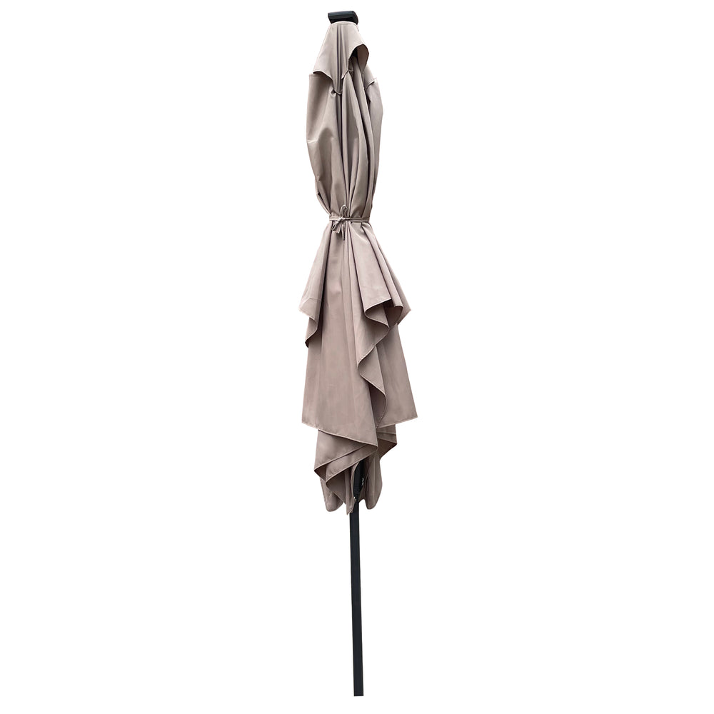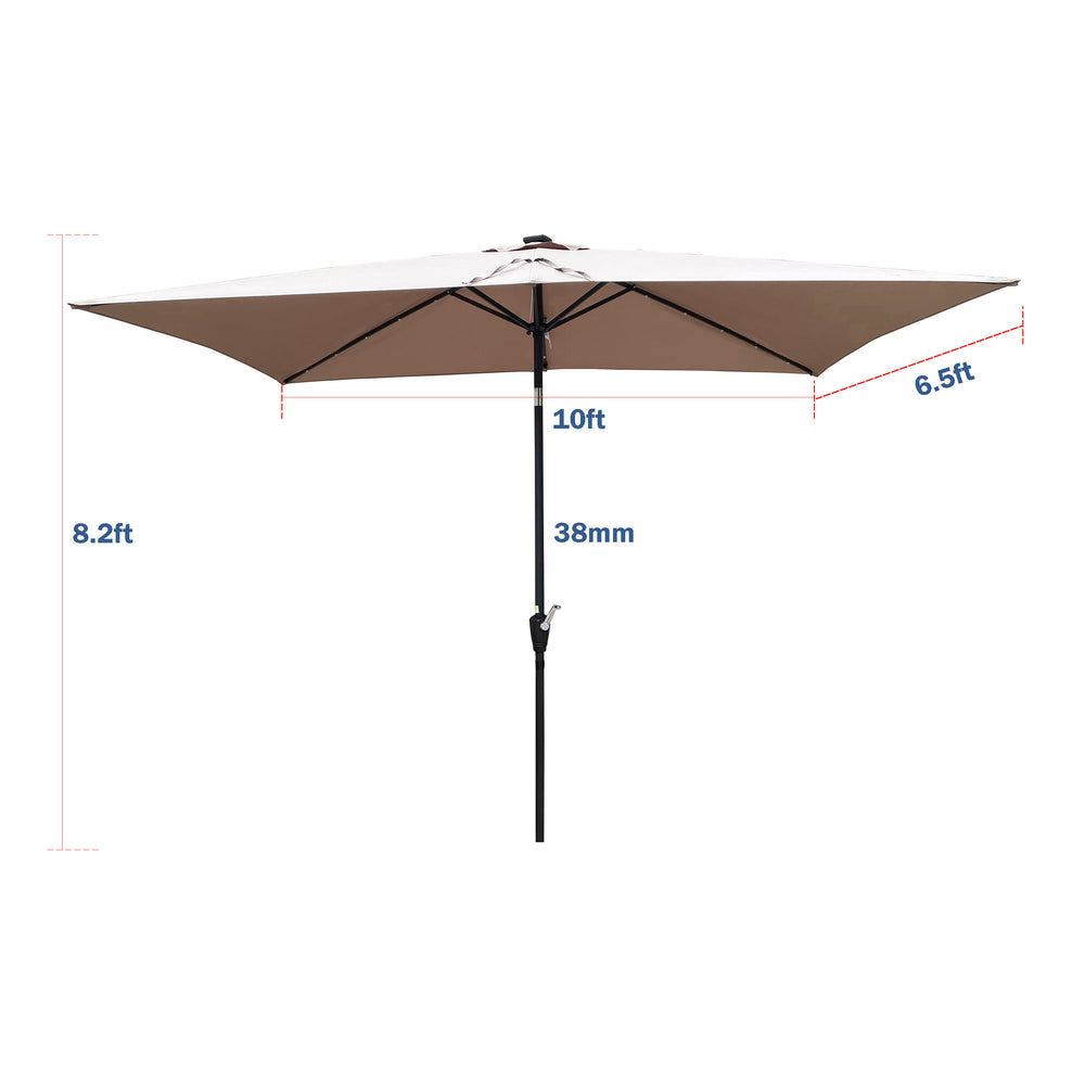 Brighten your garden, backyard, or poolside with this spacious 10 by 6.5 feet rectangular patio umbrella featuring integrated solar-powered LED lights. Crafted with a durable steel frame and a mushroom-colored, 100% polyester canopy, it offers excellent water and UV resistance with UPF 40+ protection. The 26 solar LEDs run for 6 to 8 hours after full daytime charging, creating a magical ambiance for evening relaxation or entertaining. The easy-to-use crank lift system allows smooth opening and closing, while the push-button tilt provides effortless adjustment to block the sun at any angle. With weather-resistant materials and a built-in wind vent, this umbrella is designed for lasting outdoor use. Elevate your outdoor space today with style and convenience.