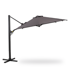 Omega Lifestyles cantilever patio umbrella features durable fabric with PU coating for sunshade, water resistance, and UV protection. Adjustable height, tilt, and 360° rotation ensure versatile shading, ideal for patios and outdoor relaxation with stable, rust-resistant aluminum frame.
