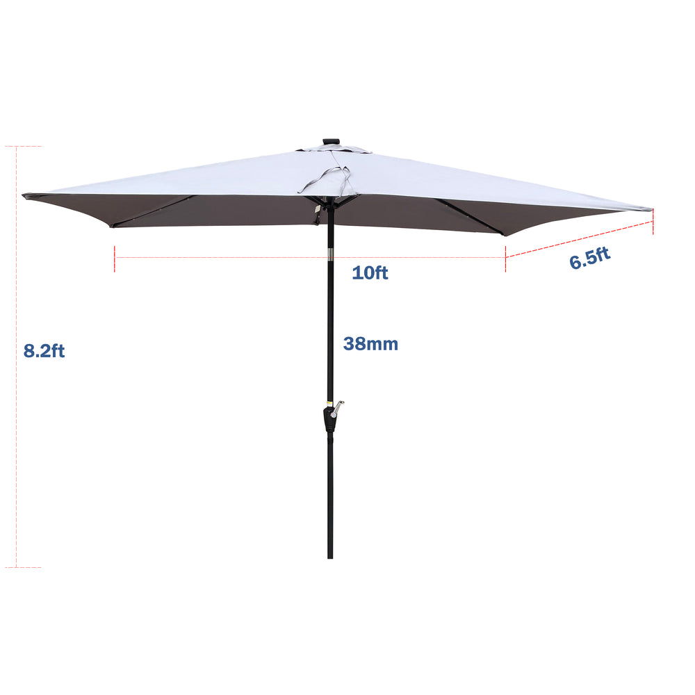10 x 6.5 ft rectangular solar LED market umbrella features a durable steel frame and waterproof, fade-resistant polyester canopy with UPF 40+ protection. Equipped with 26 solar-powered LED lights, crank lift, and push-button tilt, ideal for backyard and poolside shade.