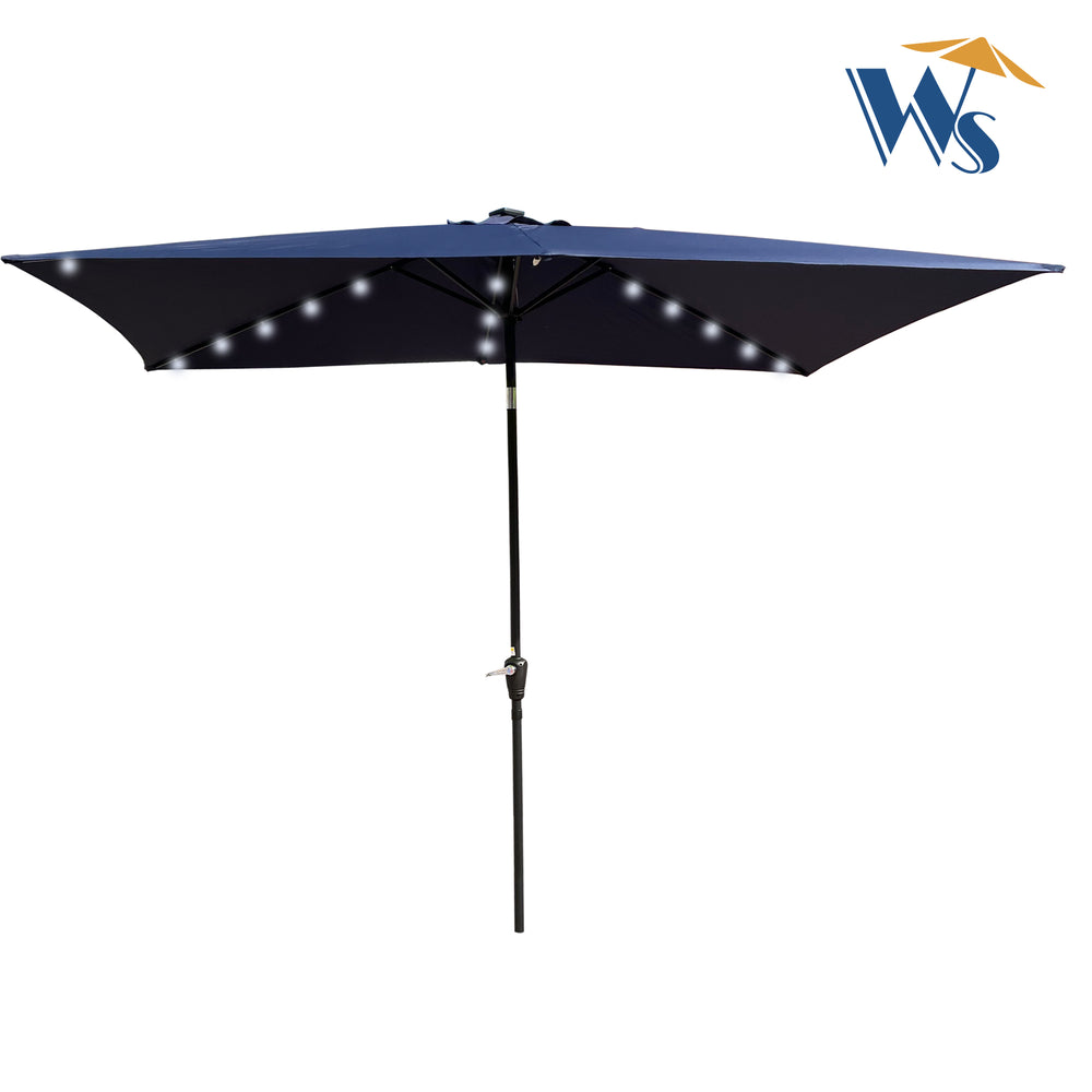 Rectangular navy blue patio umbrella with durable metal pole and 26 solar-powered LED lights provides waterproof, UV-resistant shade and ambient lighting for up to 8 hours. Features crank lift and push-button tilt for easy outdoor comfort.