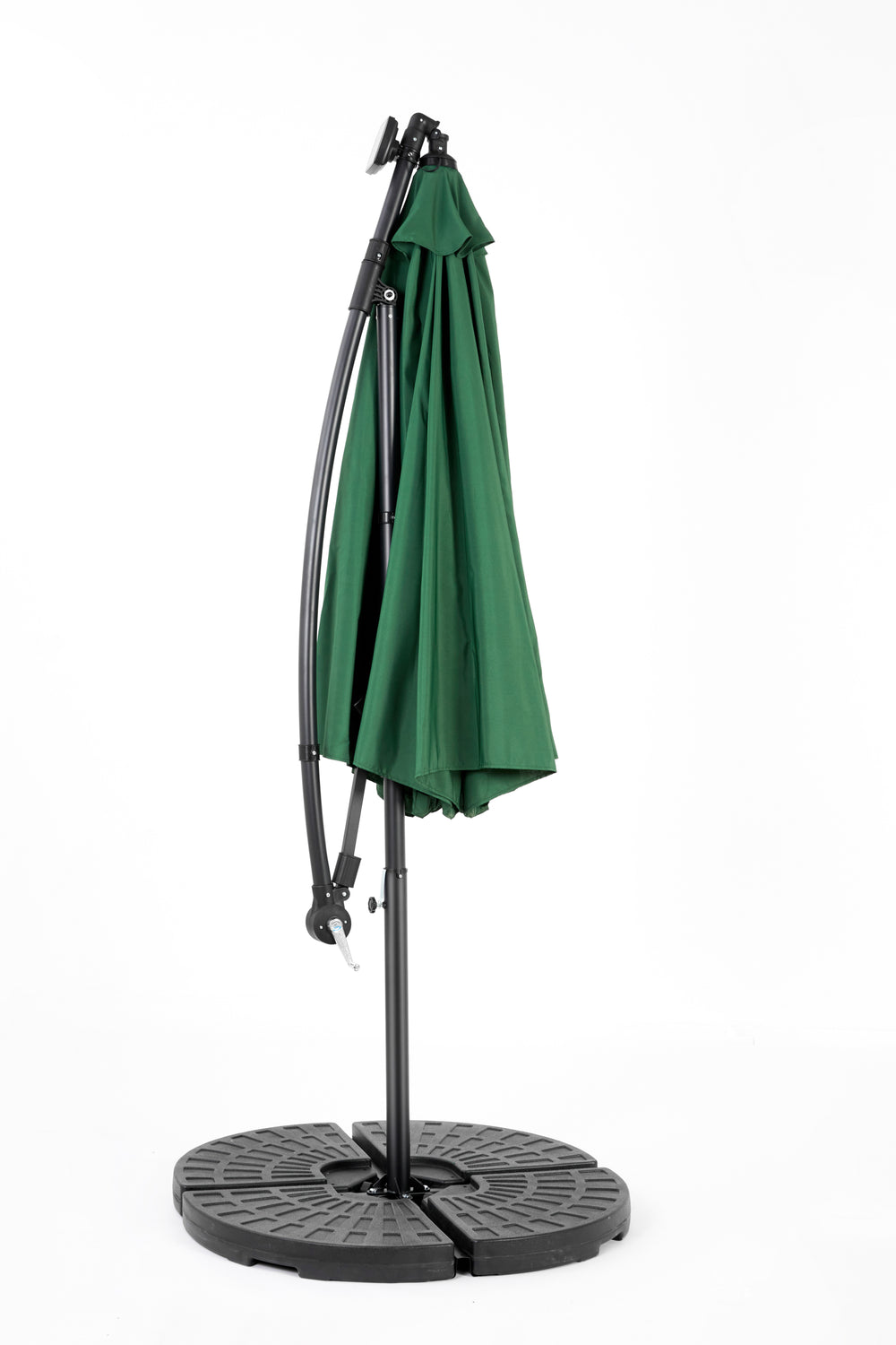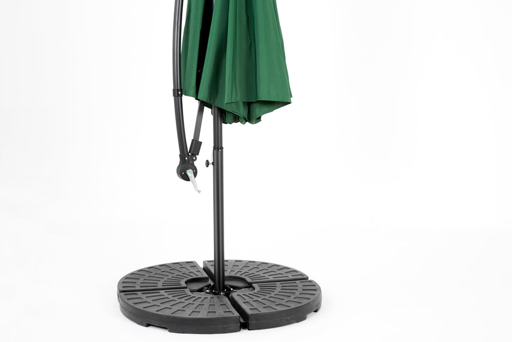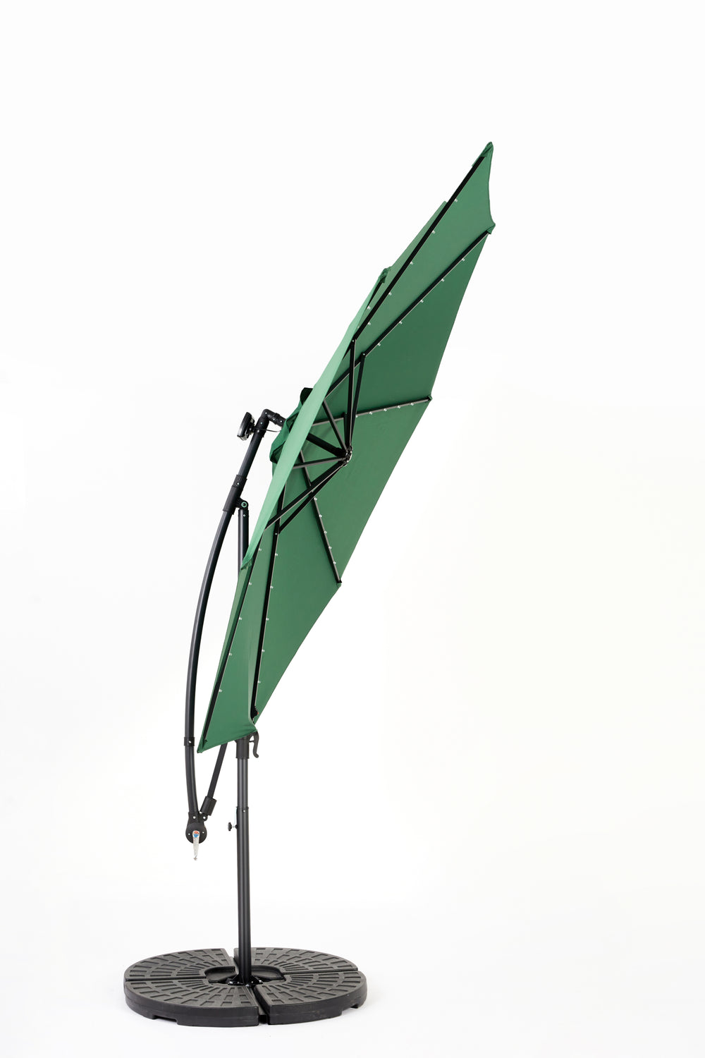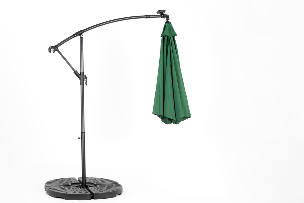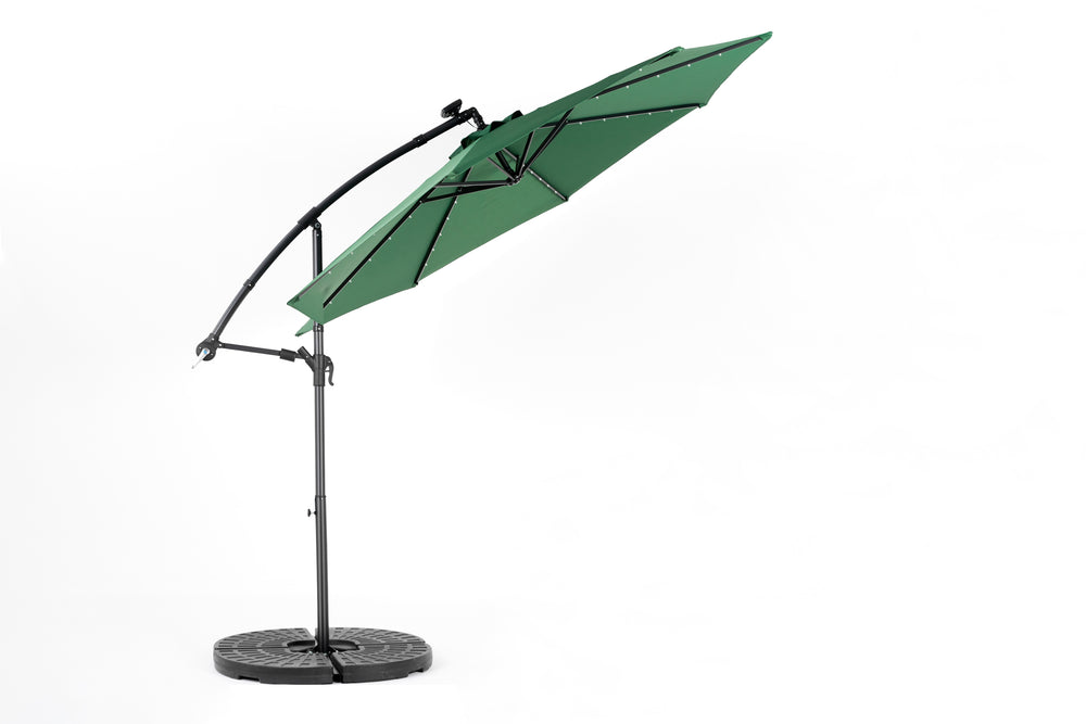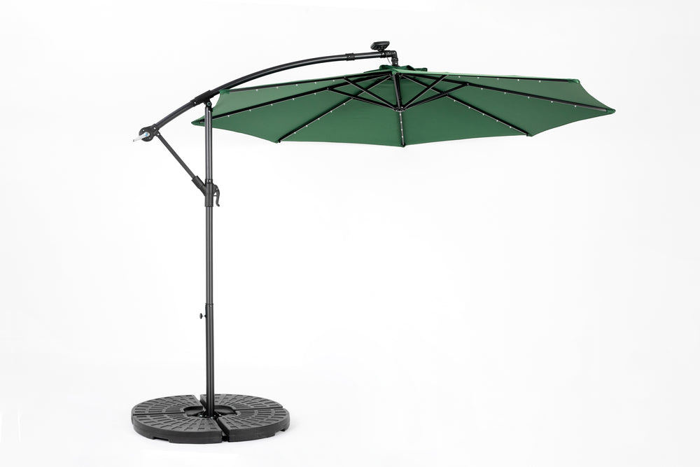 Enhance your outdoor space with this dark green 10-foot solar LED offset hanging market patio umbrella. Designed for garden, poolside, and backyard use, it offers expansive shade with a wide 116-inch (9.7 ft) diameter canopy to keep you cool and comfortable. The built-in solar panel powers 40 energy-efficient LED lights, bringing soft, stylish illumination to your evenings without extra wiring or electricity costs. Adjust the dual-handle system effortlessly to tilt and open the umbrella for perfect sun protection at any angle. Crafted from durable, rust-resistant powder-coated steel and water-resistant polyester fabric, this umbrella withstands the elements and maintains its vibrant color season after season. With enhanced wind stability from its vented canopy, cross base, and included ground stakes, it stands firm in your outdoor setting. Note: Base weights recommended for optimal stability. Elevate your outdoor relaxation and gatherings today with this versatile solar patio umbrella.