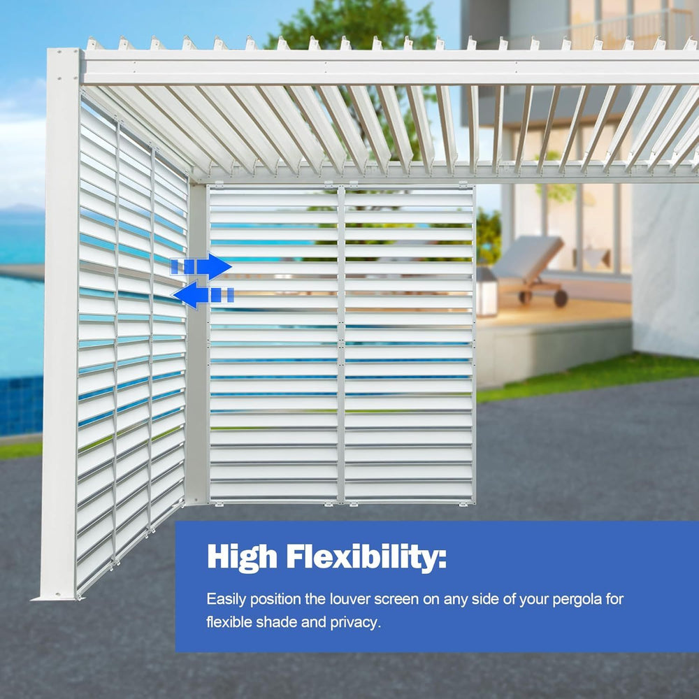 Outdoor louvered pergola screens feature a modern white aluminum design that offers weather resistance, rust protection, and sturdy wind-resistant stability. Easy to install and adjustable for customizable shading and privacy, they enhance comfort in outdoor living and relaxation spaces.
