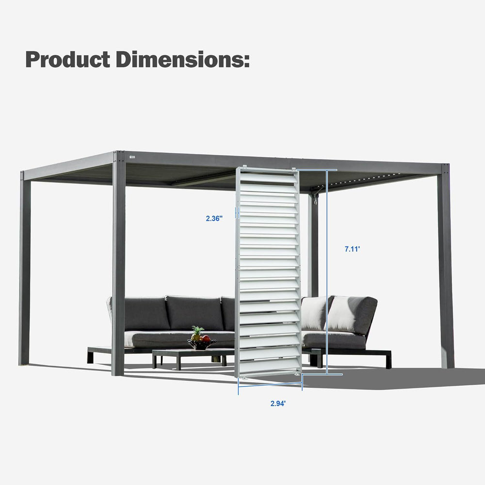 Upgrade your pergola with these sleek white aluminum louvered screens, designed to combine style and function effortlessly. Measuring 85.3 inches long by 35.3 inches wide and only 2.4 inches thick, these screens provide privacy and shade while enhancing the modern aesthetic of your outdoor living area. Crafted from premium rust-resistant aluminum, they withstand harsh weather conditions, ensuring lasting durability. Easy to install with flexible positioning options, these screens allow you to customize your pergola’s light and airflow according to your preferences. The stable base design offers excellent wind resistance for safe, year-round outdoor enjoyment. Perfect for balconies, gardens, or patios, these pergola screens create a comfortable and inviting atmosphere so you can relax outdoors with confidence. Elevate your outdoor living today with these stylish and practical pergola accessories.