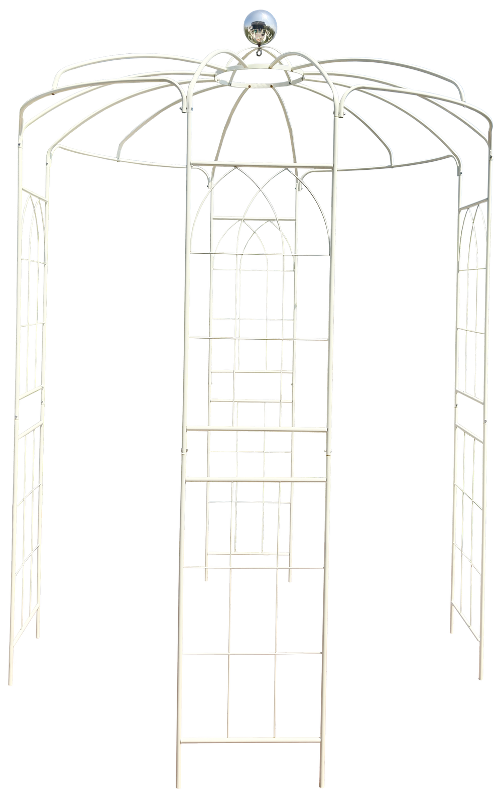 Transform your garden or event space with this elegant metal garden arch, designed in a charming birdcage shape. Crafted from sturdy iron with a cream white finish, this garden arbor adds a captivating focal point perfect for weddings, ceremonies, or any outdoor gathering. Measuring 81.3 inches in diameter and 114.2 inches (9.5 ft) high, it offers ample space for floral decorations or climbing vines, creating a magical backdrop. The galvanized tubes with powder coating provide strong wind resistance and superior rust protection, ensuring durability in all seasons. Easy to assemble with detailed instructions and requiring just a helping hand, this garden arch combines style and stability to elevate your outdoor ambiance. Elevate your special moments with this versatile, eye-catching garden centerpiece today.