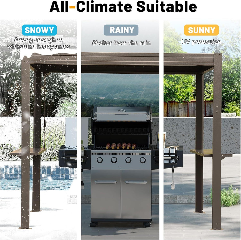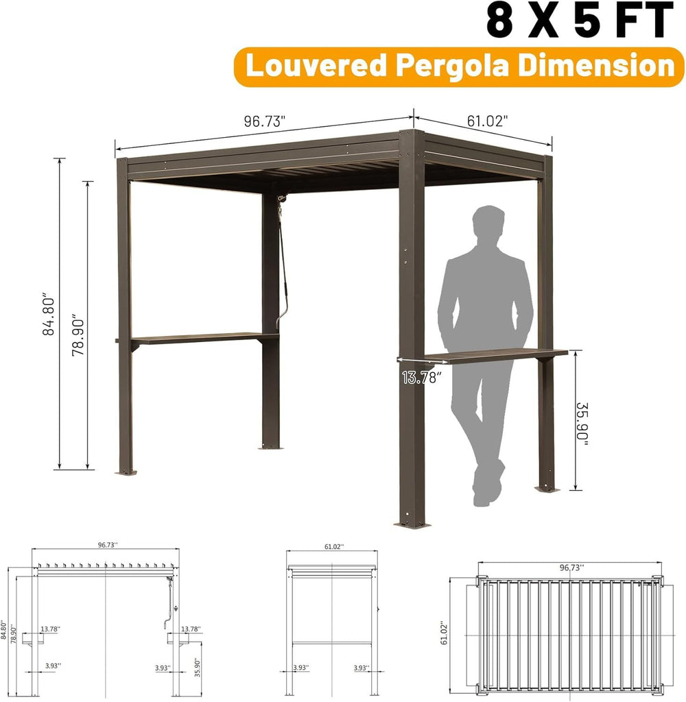 Designed for grilling enthusiasts, this 8x5 ft metal grill louvered pergola offers a perfect blend of functionality and style for your backyard or patio. Constructed from durable galvanized steel with a rust-resistant powder-coated finish, it stands up against outdoor elements to provide lasting protection for your grill. The adjustable louvered roof, controlled by an easy crank handle, lets you customize ventilation from fully closed to wide open, helping to manage smoke, heat, and sunlight for ideal grilling conditions all year round. An integrated gutter system channels rainwater away, keeping your cooking area dry and comfortable. Plus, convenient side shelves and a built-in bottle opener add practical touches that make outdoor entertaining effortless. Elevate your outdoor grilling experience today with this sturdy, versatile metal shelter.