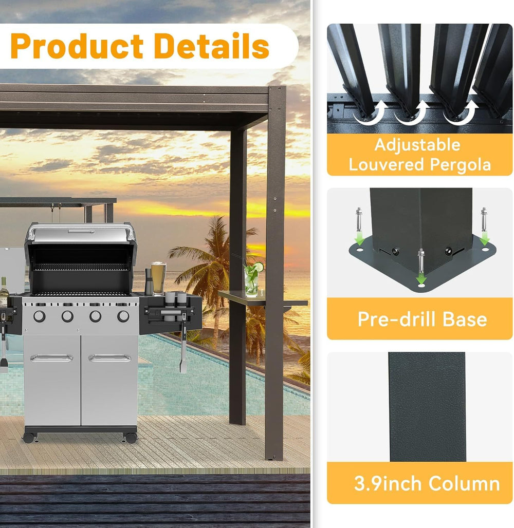 This durable metal grill louvered pergola features an adjustable rainproof roof and built-in gutter system for efficient drainage, offering rust and UV resistance. Ideal for outdoor grilling and social gatherings, it ensures year-round comfort and protection in garden or patio spaces.