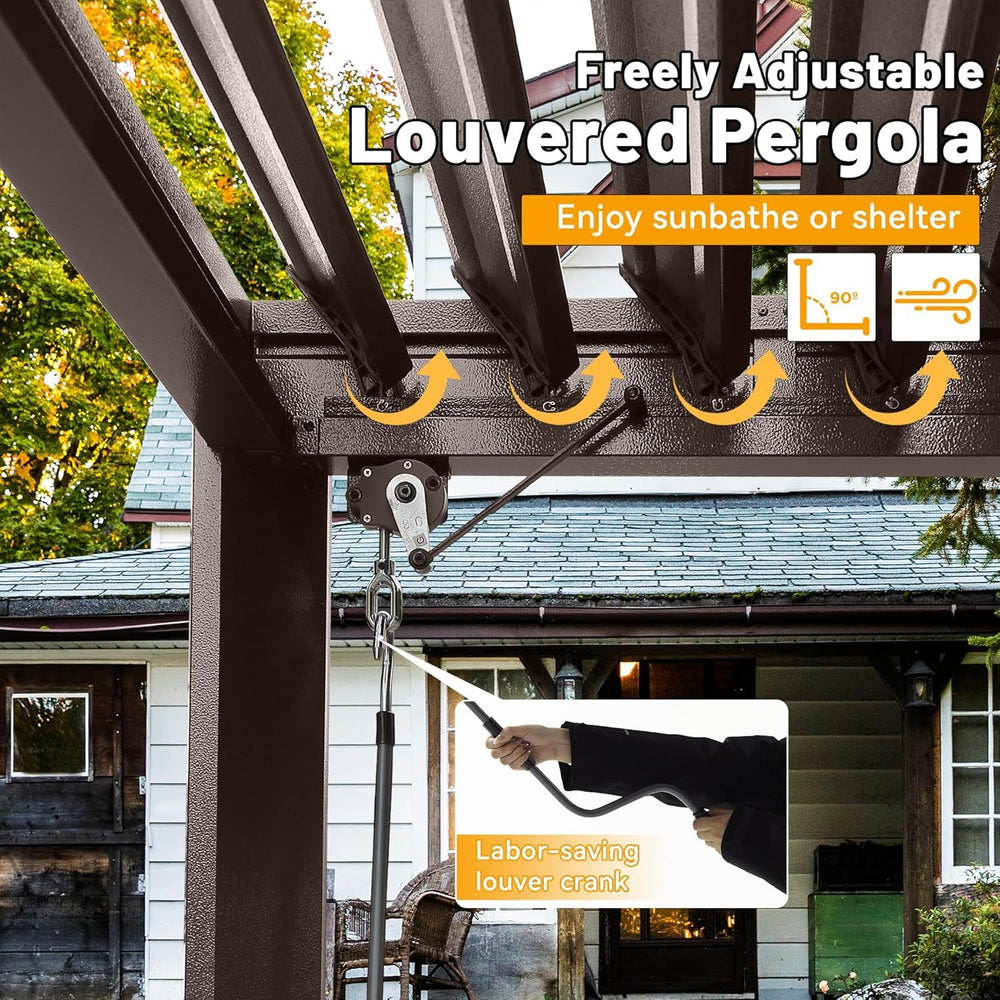 - Adjustable Louvered Roof: Crank handle adjusts louvers from 0° to 90° for optimal shade and airflow