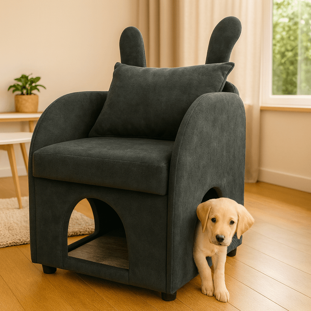 Dark gray pet-friendly armchair features scratch-resistant fabric, thick foam cushion, and a spacious built-in pet hideaway with triple-entry openings. Its cute bunny-ear backrest adds style while offering comfort and security for small pets in compact living spaces.