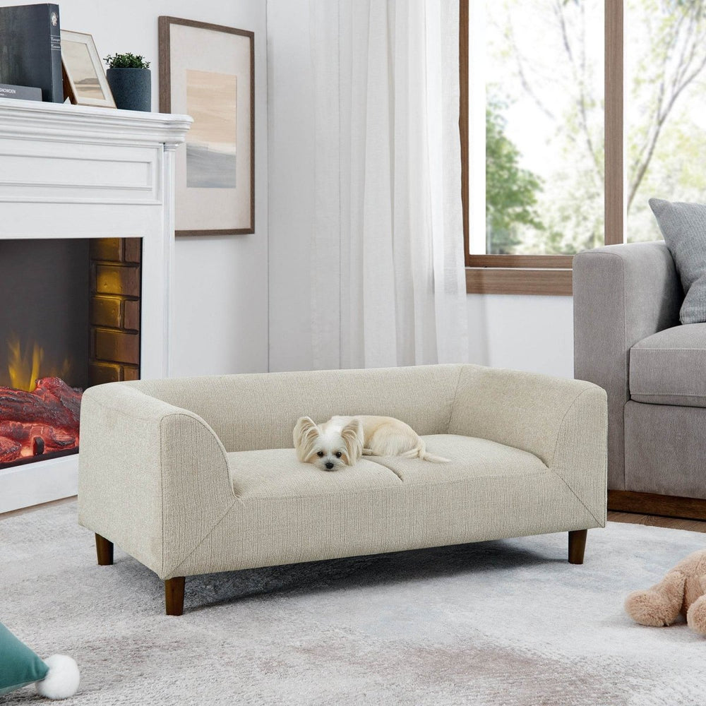 Modern beige linen pet sofa features foam cushioning with armrests and backrest designed for medium and large dogs, promoting relaxation and proper posture. Stable short leg design offers easy access and support, ideal for small to medium pets seeking comfort and rest.