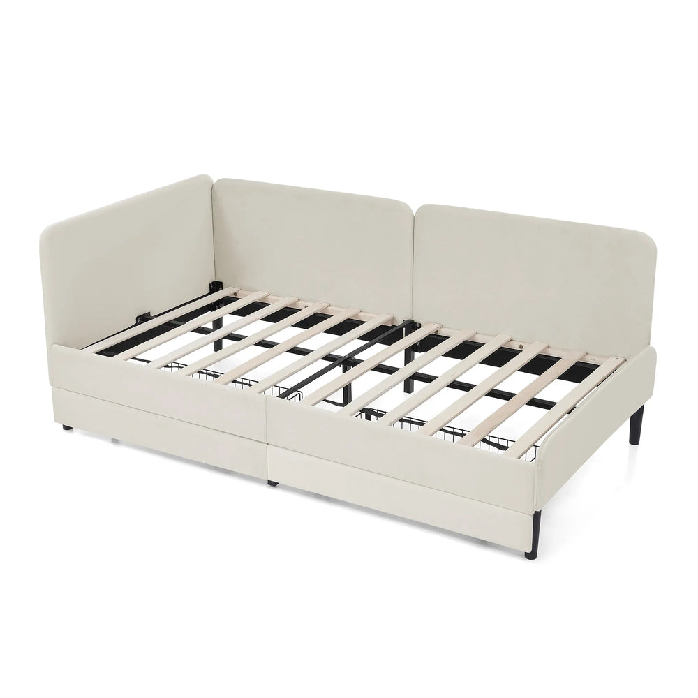 Designed for modern bedrooms, this twin-size upholstered platform bed frame effortlessly combines style, functionality, and comfort. Crafted with a durable eucalyptus wood and plywood frame, it supports up to 300 lbs for reliable everyday use. The soft beige velvet upholstery, filled with plush foam cushioning, creates a cozy sitting and sleeping surface perfect for lounging or overnight guests. Its versatile design easily converts between a sofa and bed, making it ideal for small spaces or multi-use rooms. Enjoy added convenience with two spacious storage drawers featuring smooth-rolling wheels, providing hidden space to store bedding or essentials. This contemporary platform bed requires no box spring, streamlining your bedroom setup with sleek elegance. Elevate your living space today with this stylish and practical velvet sofa bed.