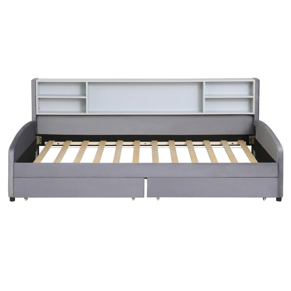 Experience both style and functionality with this elegant gray velvet twin platform bed. The plush velvet upholstery enhances your bedroom decor with a soft, inviting texture while providing a comfortable padded headboard perfect for reading or relaxing. Designed with smart storage solutions, it features two spacious, smooth-gliding drawers ideal for organizing bedding, clothes, or personal items, keeping your space clutter-free. A built-in side shelf adds convenience by offering additional room for books or decor. Constructed from durable MDF and plywood with ten supportive slats, this bed ensures lasting stability without needing a box spring. Its compact twin size (78.3"L x 43.7"W x 32.2"H) makes it ideal for smaller rooms or guest spaces. Easy assembly with included tools allows you to enjoy a stylish and organized bedroom in no time. Elevate your relaxation and storage today with this versatile upholstered platform bed.