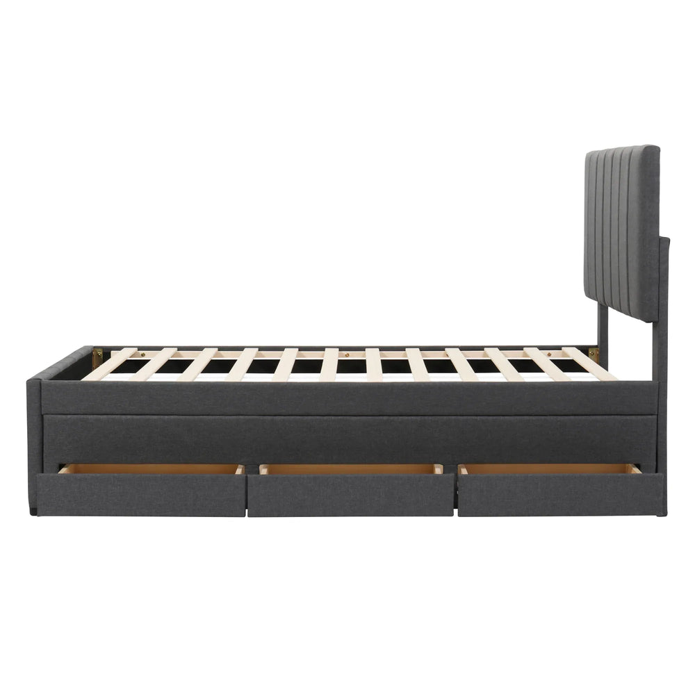 Elevate your bedroom with this stylish twin size upholstered platform bed featuring a modern gray linen fabric that combines comfort and classic design. Crafted with a sturdy plywood and MDF frame, it ensures stability and durability, supported by a solid wooden slat system for enhanced mattress support. Perfect for guest rooms or children's bedrooms, the built-in trundle offers an extra sleeping space for sleepovers, while three spacious drawers underneath provide smart storage for toys, bedding, or essentials—helping you keep your space neat and organized. The sleek stripe headboard adds a refined touch that complements any décor. Easy to assemble with clear instructions and all necessary hardware included, this bed blends functionality with timeless style. Transform your living space and enjoy versatile convenience every day. Elevate your relaxation and storage solutions today.