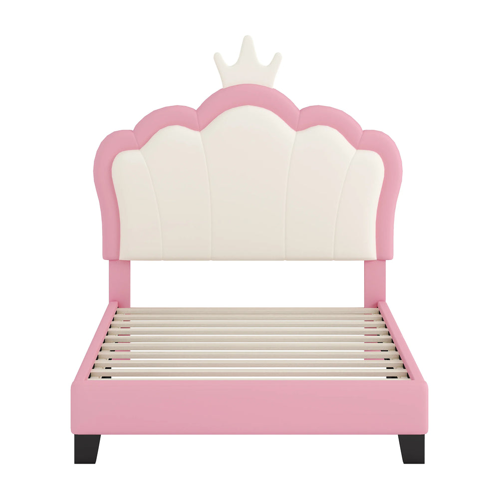 Twin size upholstered princess platform bed features a charming crown headboard and sturdy PU leather upholstery. Built with solid pine wood and 10 slats, it supports up to 250 lbs, ensuring stability and quiet comfort for girls’ bedrooms. Assembly required.