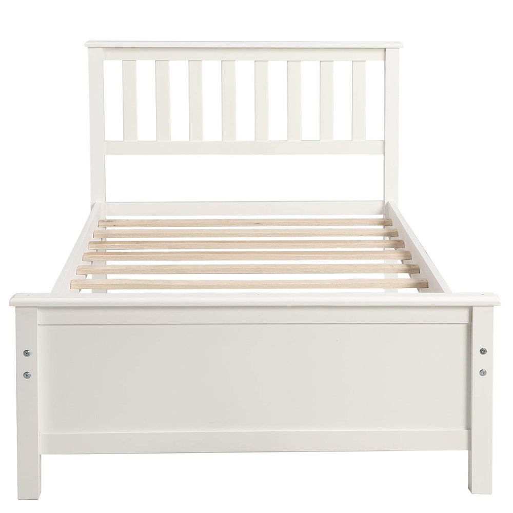 This twin wood platform bed features a classic white finish with solid pine wood construction and ten supportive wood slats for enhanced stability. Its headboard and footboard design prevents pillows from falling, ideal for minimalist bedrooms seeking durable, stylish furniture.
