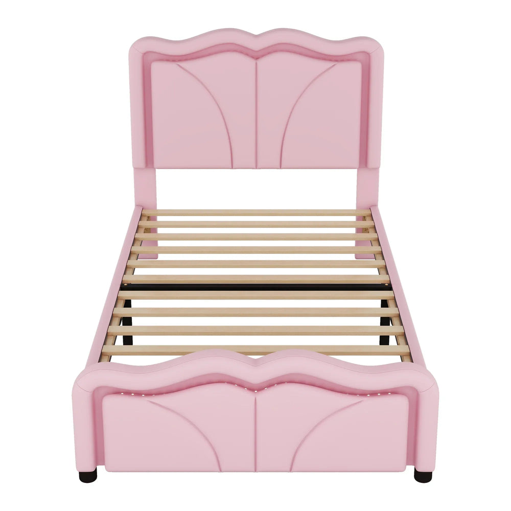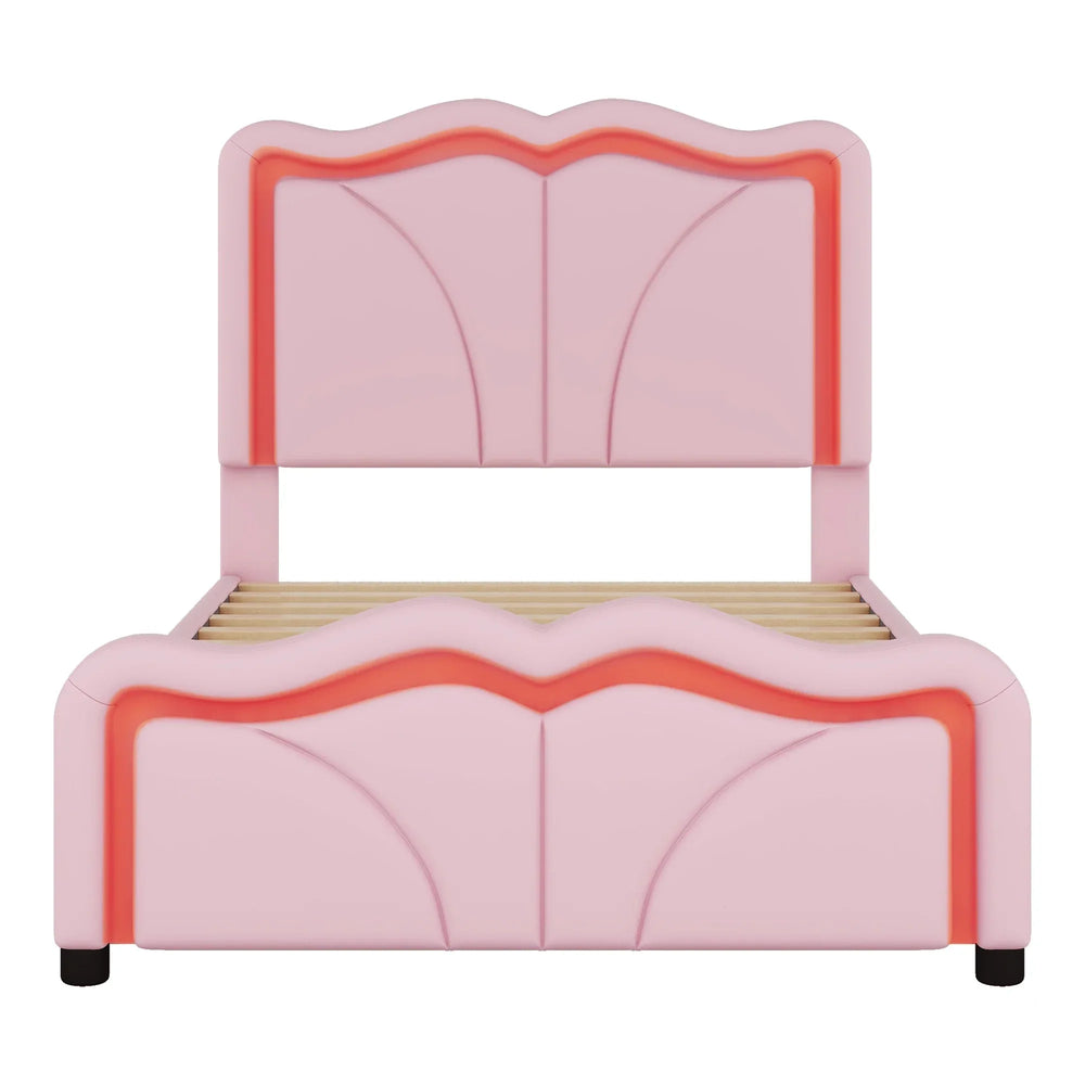 Bring style, comfort, and functionality to your little one’s room with this charming Twin Upholstered Platform Bed in a playful pink hue. Featuring a gently curved, height-adjustable headboard padded with easy-to-clean PU leather, it offers both safety and cozy support. Built on a sturdy pine wood and MDF frame with solid wood legs, this bed delivers lasting durability while eliminating the need for a box spring. Integrated LED light strips gently illuminate the head and foot areas, making nighttime navigation safer and more convenient. Its adjustable headboard with three height settings adapts perfectly to growing kids and changing needs. With its whimsical design and strong construction, this platform bed creates a fun and inviting sleeping space your child will adore. Assembly is simple with clear instructions included—transform your child’s room effortlessly today.