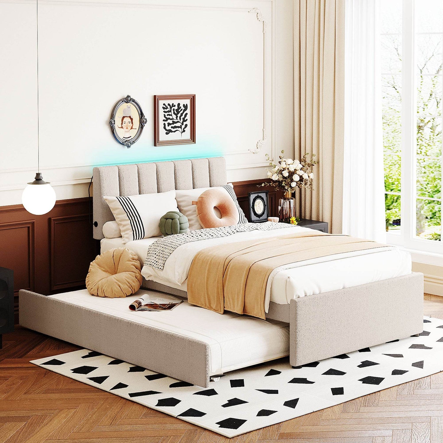 Embrace a blend of style and functionality with this twin-sized upholstered platform bed, featuring ultra-soft teddy fleece in a calming beige tone. Designed with clean lines and a striped headboard, it adds a classic yet cozy atmosphere to any bedroom. The integrated trundle offers versatile extra sleeping space, perfect for guests or sleepovers, while saving room when not in use. Control built-in LED lights easily via remote or mobile app to create a warm, romantic ambiance or serve as a gentle night light. Crafted from durable particle board and MDF, this solid bed frame ensures long-lasting stability and support. Partial assembly is straightforward with all necessary tools included, and no box spring is required. Elevate your bedroom’s comfort and style today with this smart, space-saving twin bed.