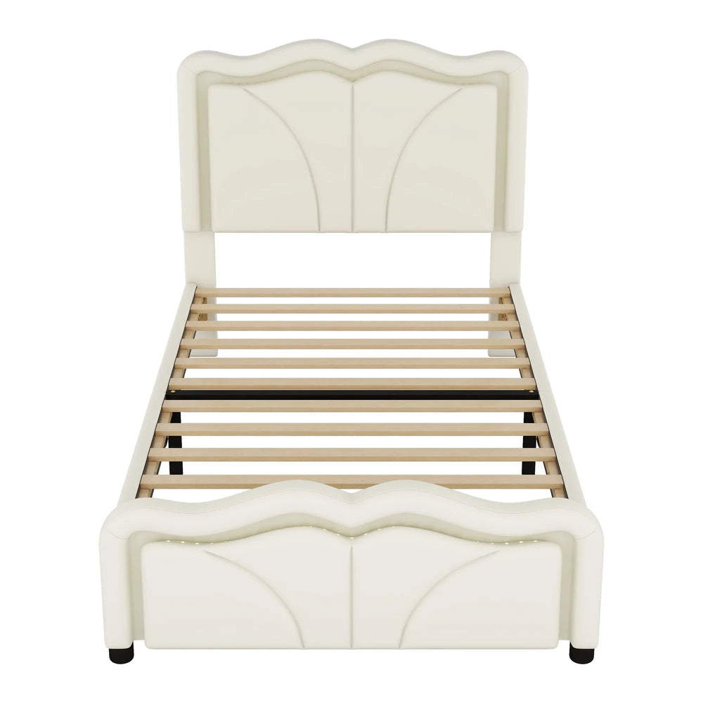 Designed with both comfort and style in mind, this twin platform bed features a smoothly curved upholstered headboard padded with soft sponge and high-quality PU leather that’s easy to clean and gentle against little heads. The adjustable headboard offers three height settings, allowing customization as your child grows. Integrated LED light strips at the head and foot provide a soft glow for safe nighttime navigation. Built on a solid pine wood and MDF frame with sturdy wooden supports, this bed requires no box spring and promises long-lasting stability. Its fun, modern design adds a playful yet elegant touch to your child’s bedroom, creating a cozy retreat they’ll love. Assembly is straightforward with clear instructions and pre-drilled holes. Create a charming and safe sleeping space for your little one—upgrade their bedroom today.