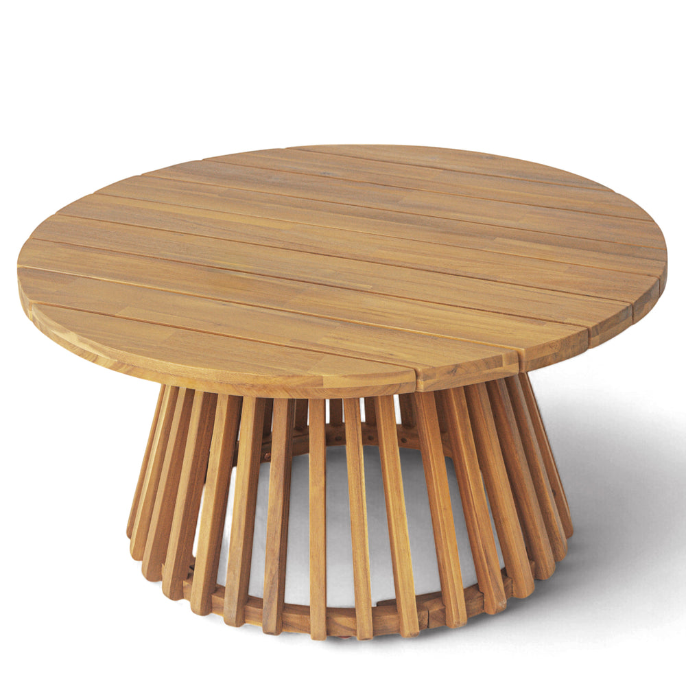 - Round Coffee Table: 31.5-inch diameter top with a unique slatted base, standing 16 inches tall and supporting up to 215 lbs.