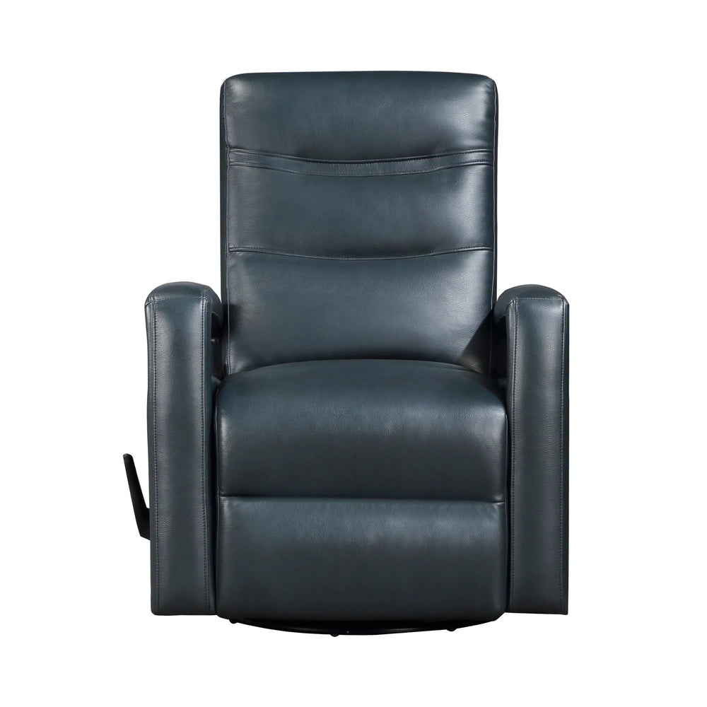 Elevate your living space with this contemporary swivel glider recliner upholstered in breathable navy blue faux leather. Designed for ultimate relaxation, the chair features a smooth 360-degree swivel and gentle gliding motion, allowing you to unwind effortlessly. Its open arm design and plush high-density foam padding over pocket coils deliver exceptional comfort, while the solid wood and plywood frame with a metal-reinforced seat ensures long-lasting durability. Easy to recline using the side-mounted pull handle, this manual recliner supports up to 300 lbs and fits perfectly in any modern home. Compact dimensions make it ideal for primary living areas, providing both style and function. Upgrade your comfort zone today with this stylish swivel glider recliner.