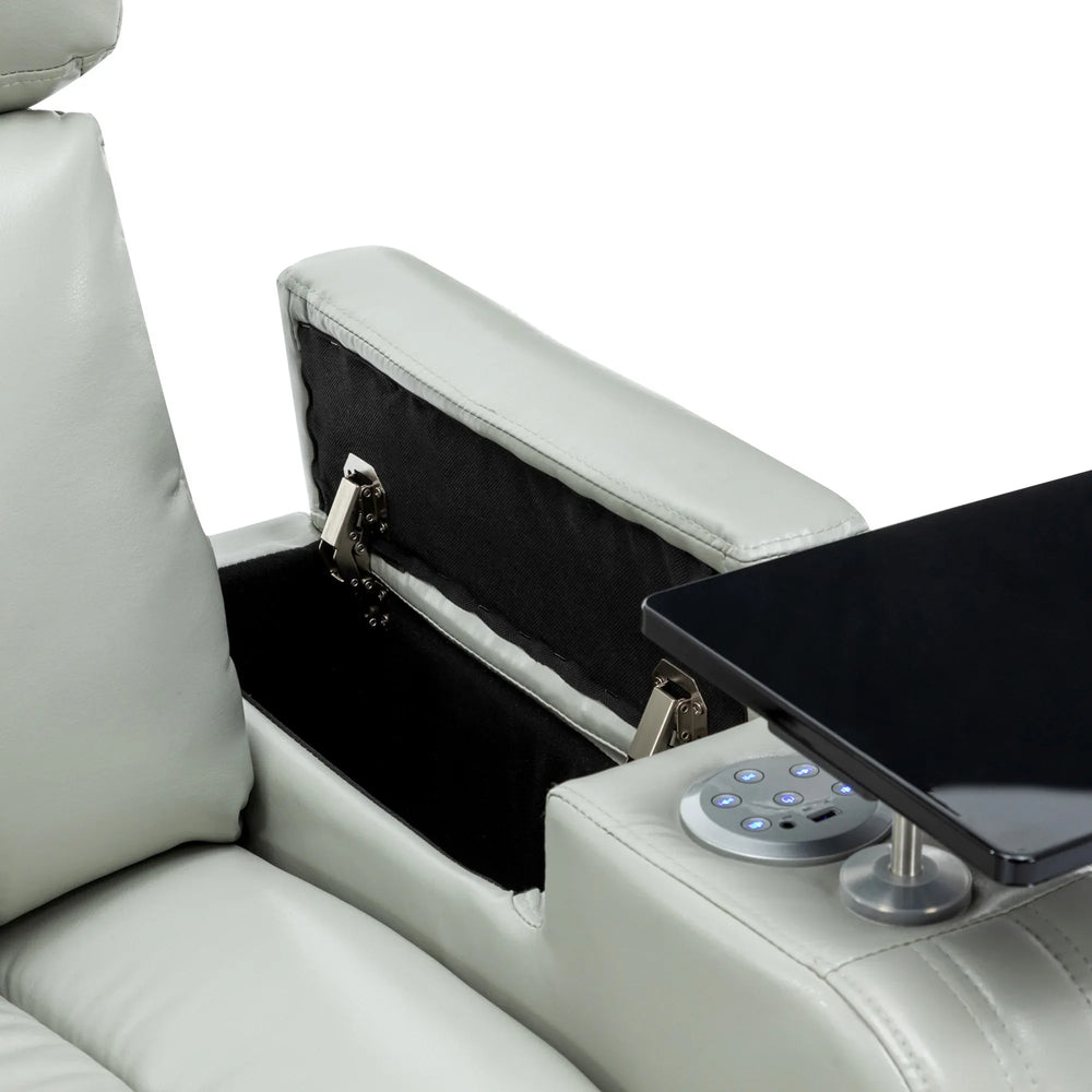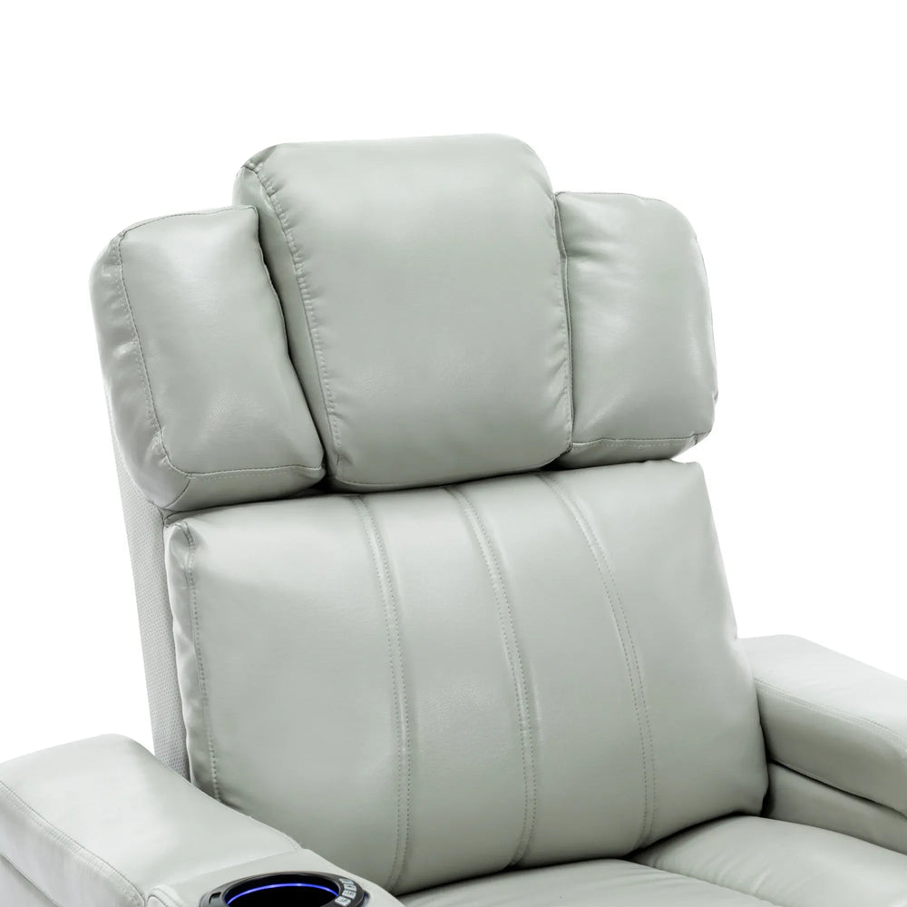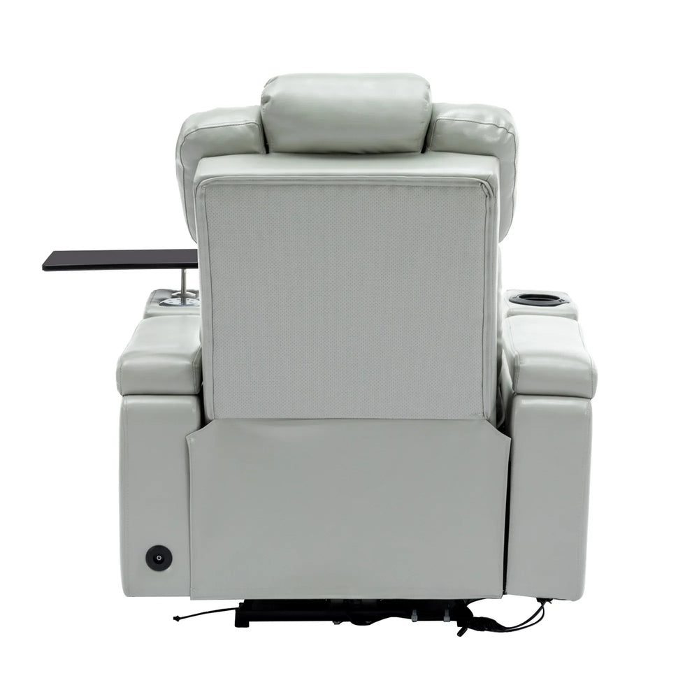 Relax in style and convenience with this modern PU leather power recliner, designed to bring high-tech comfort and functionality to your living space. Upholstered in soft, durable grey PU leather with plush foam cushioning, it offers a cozy seat that supports you through movie nights and downtime. The power reclining mechanism allows effortless adjustment to your preferred position between 110° and 140°, while a built-in cooling cup holder keeps your drinks refreshingly chilled. Integrated Bluetooth speakers deliver immersive stereo surround sound with deep bass, enhancing your entertainment experience. Thoughtful features like LED lighting, a swiveling tray table, dual USB ports, and hidden storage compartments put everything within easy reach, reducing clutter and increasing convenience. With sturdy iron and plywood framing paired with metal legs, this chair offers long-lasting durability and stability. Elevate your relaxation today with this all-in-one power recliner that blends comfort, technology, and style seamlessly.